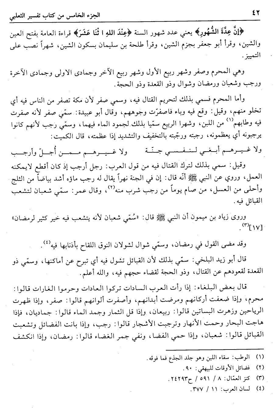 محرم، وإذا ضعفت أركانهم ومرضت أبدانهم، واصفرت ألوانهم قالوا: صفر، وإذا ظهرت الرياحين وزهرت البساتين قالوا: ربيعان، وإذا قل الثمار وجمد الماء قالوا: جماديان، فإذا هاجت البحار وحمت الأنهار وترجبت الأشجار قالوا: رجب، وإذا بانت الفضائل وتشعبت القبائل قالوا: شعبان، وإذا حمي الفضا، ونفي جمر الغضاء قالوا: رمضان، وإذا انكشف