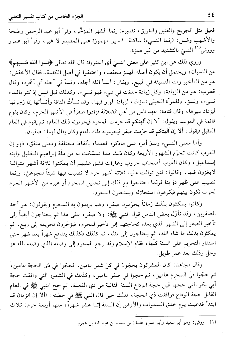 فعيل مثل الجريح والقتيل والغريق، تقديره: إنما الشهر المؤخّر، وقرأ أبو عبد الرحمن وطلحة والأشهب وشبل: (إِنَّمَا النَّسْئُ) ساكنة السين مهموزة على المصدر لا غير، وقرأ أبو عمرو وورش «1» النسيّ بالتشديد من غير همزة.