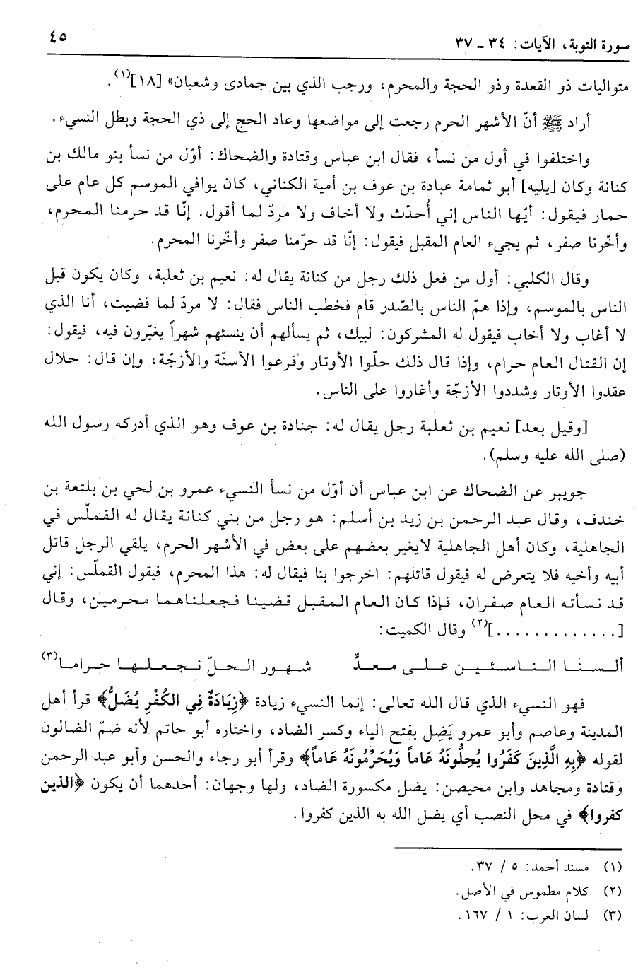 وقال الكلبي: أول من فعل ذلك رجل من كنانة يقال له: نعيم بن ثعلبة، وكان يكون قبل الناس بالموسم، وإذا همّ الناس بالصّدر قام فخطب الناس فقال: لا مردّ لما قضيت، أنا الذي لا أغاب ولا أخاب فيقول له المشركون: لبيك، ثم يسألهم أن ينسئهم شهرا يغيّرون فيه، فيقول: