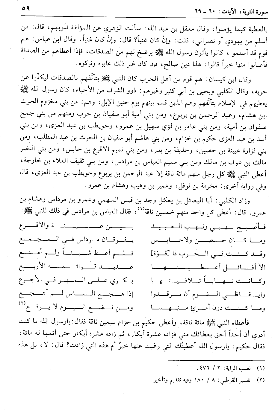 ، وقال الكلبي ويحيى بن أبي كثير وغيرهم: ذوو الشرف من الأحياء، كان رسول الله صلى الله عليه وسلّم يعطيهم في الإسلام يتألّفهم وهم الذين قسم بينهم يوم حنين الإبل، وهم: من بني مخزوم الحرث ابن هشام، وعبد الرحمن بن يربوع، ومن بني أمية أبو سفيان بن حرب ومنهم من بني جمح صفوان بن أمية، ومن بني عامر بن لؤي سهيل بن عمرو، وحويطب بن عبد العزى، ومن بني أسد بن عبد العزى حكيم بن خزام، ومن بني هاشم أبو سفيان بن الحرث بن عبد المطلب، ومن بني فزارة عيينة بن حصين، وحذيفة بن بدر، ومن بني تميم الأقرع بن حابس، ومن بني النضر مالك بن عوف بن مالك ومن بني سليم العباس بن مرداس، ومن بني ثقيف العلاء بن خارجة، أعطى النبي صلى الله عليه وسلّم كل رجل منهم مائة ناقة إلا عبد الرحمن بن يربوع وحويطب بن عبد العزى، قال وفي رواية أخرى: مخرمة بن نوفل، وعمير بن وهيب وهشام بن عمرو.