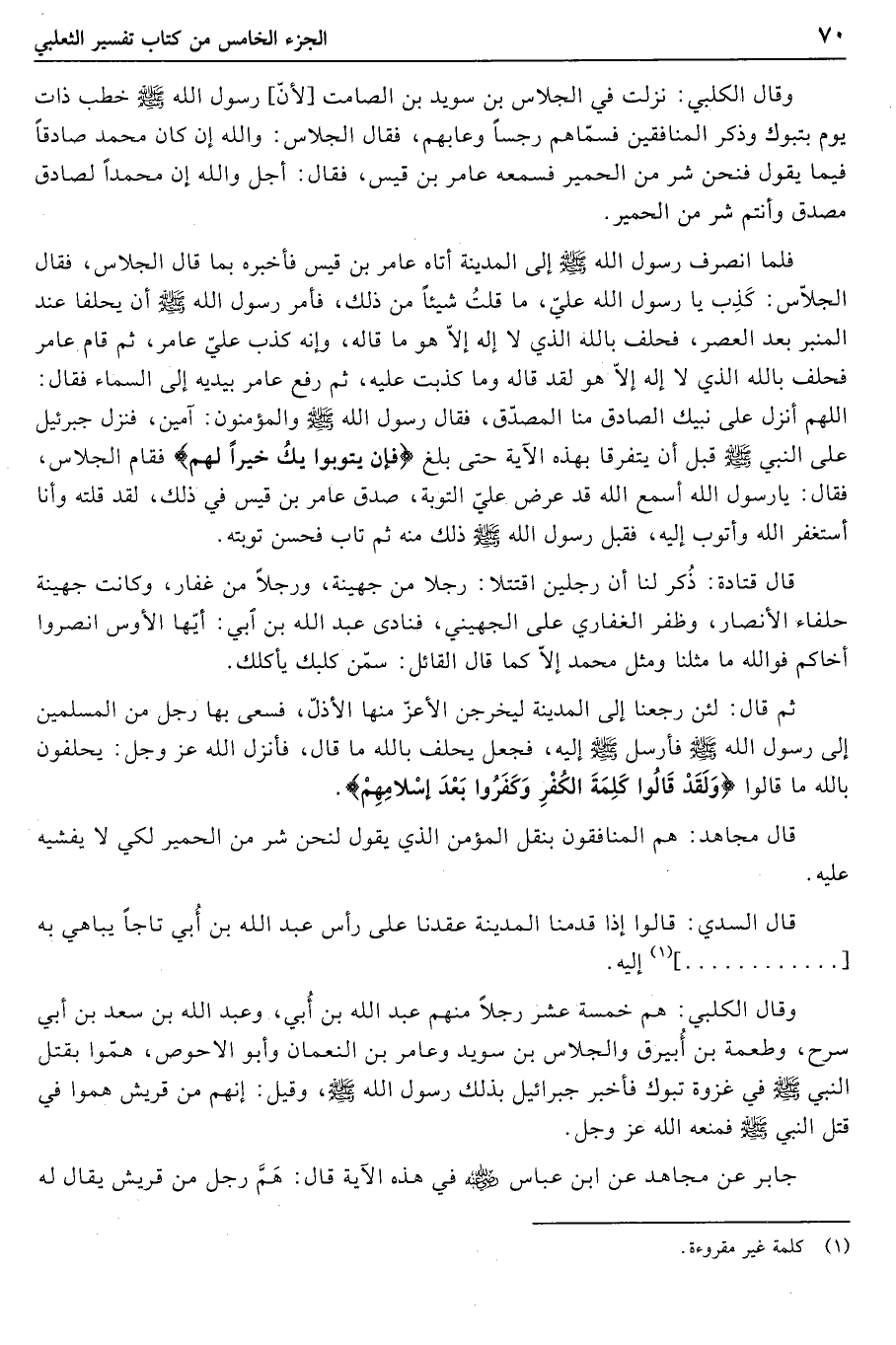 اللهم أنزل على نبيك الصادق منا المصدّق، فقال رسول الله صلى الله عليه وسلّم والمؤمنون: آمين، فنزل جبرئيل على النبي صلى الله عليه وسلّم قبل أن يتفرقا بهذه الآية حتى بلغ فَإِنْ يَتُوبُوا يَكُ خَيْراً لَهُمْ فقام الجلاس، فقال: يا رسول الله أسمع الله قد عرض عليّ التوبة، صدق عامر بن قيس في ذلك، لقد قلته وأنا أستغفر الله وأتوب إليه، فقبل رسول الله صلى الله عليه وسلّم ذلك منه ثم تاب فحسن توبته.
