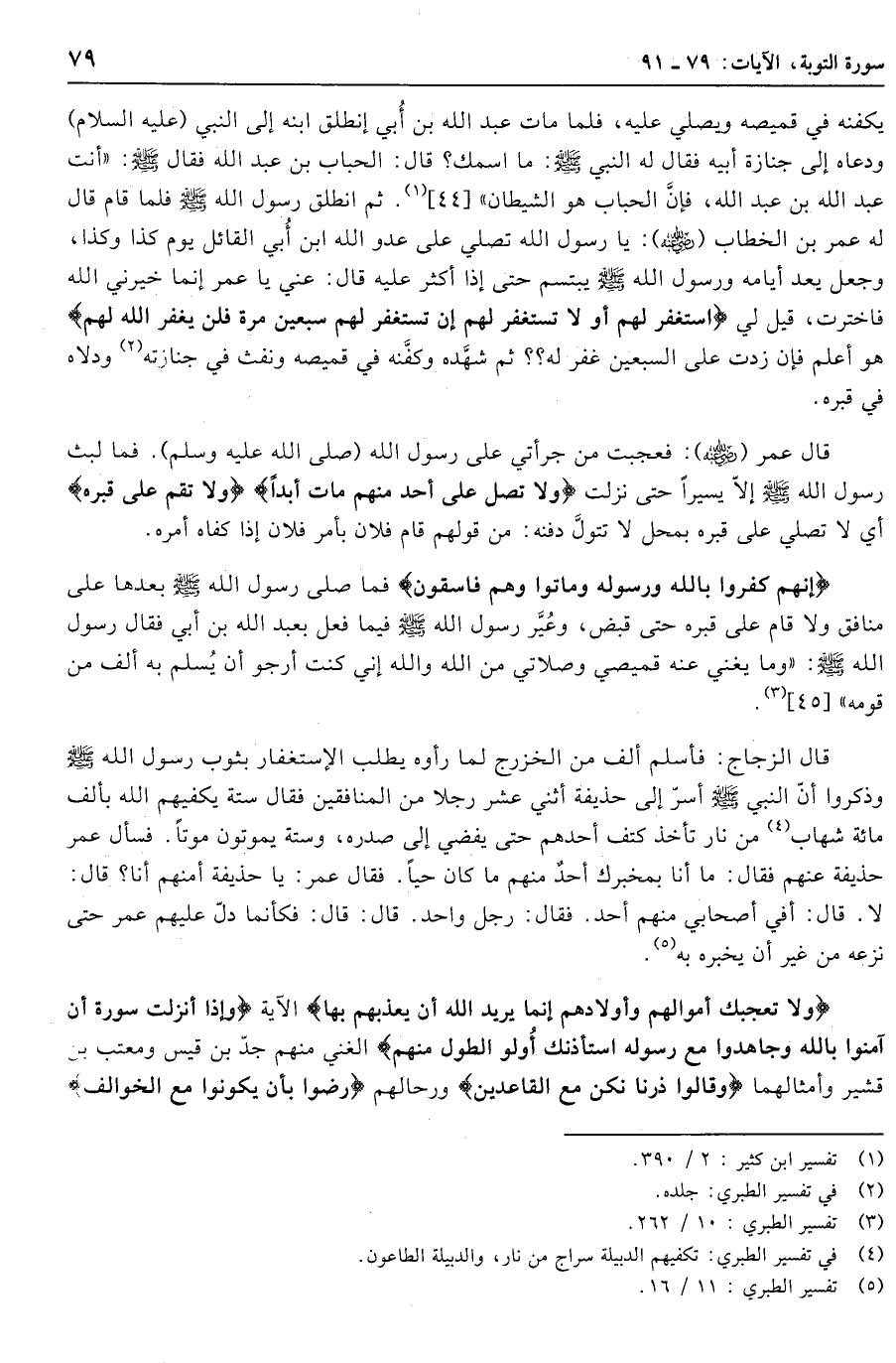 قال عمر (رضي الله عنه) : فعجبت من جرأتي على رسول الله (صلى الله عليه وسلّم) . فما لبث رسول الله صلى الله عليه وسلّم إلّا يسيرا حتى نزلت وَلا تُصَلِّ عَلى أَحَدٍ مِنْهُمْ ماتَ أَبَداً وَلا تَقُمْ عَلى قَبْرِهِ أي لا تصلي على قبره بمحل لا تتولّ دفنه: من قولهم قام فلان بأمر فلان إذا كفاه أمره.