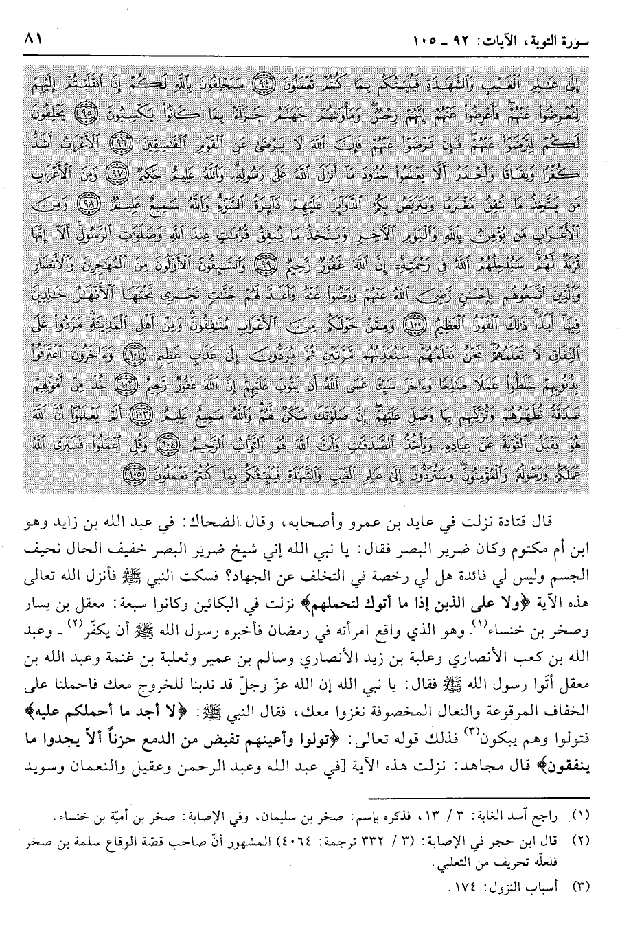 وَلا عَلَى الَّذِينَ إِذا ما أَتَوْكَ لِتَحْمِلَهُمْ قُلْتَ لا أَجِدُ ما أَحْمِلُكُمْ عَلَيْهِ تَوَلَّوْا وَأَعْيُنُهُمْ تَفِيضُ مِنَ الدَّمْعِ حَزَناً أَلاَّ يَجِدُوا ما يُنْفِقُونَ (92) إِنَّمَا السَّبِيلُ عَلَى الَّذِينَ يَسْتَأْذِنُونَكَ وَهُمْ أَغْنِياءُ رَضُوا بِأَنْ يَكُونُوا مَعَ الْخَوالِفِ وَطَبَعَ اللَّهُ عَلى قُلُوبِهِمْ فَهُمْ لا يَعْلَمُونَ (93) يَعْتَذِرُونَ إِلَيْكُمْ إِذا رَجَعْتُمْ إِلَيْهِمْ قُلْ لا تَعْتَذِرُوا لَنْ نُؤْمِنَ لَكُمْ قَدْ نَبَّأَنَا اللَّهُ مِنْ أَخْبارِكُمْ وَسَيَرَى اللَّهُ عَمَلَكُمْ وَرَسُولُهُ ثُمَّ تُرَدُّونَ إِلى عالِمِ الْغَيْبِ وَالشَّهادَةِ فَيُنَبِّئُكُمْ بِما كُنْتُمْ تَعْمَلُونَ (94) سَيَحْلِفُونَ بِاللَّهِ لَكُمْ إِذَا انْقَلَبْتُمْ إِلَيْهِمْ لِتُعْرِضُوا عَنْهُمْ فَأَعْرِضُوا عَنْهُمْ إِنَّهُمْ رِجْسٌ وَمَأْواهُمْ جَهَنَّمُ جَزاءً بِما كانُوا يَكْسِبُونَ (95) يَحْلِفُونَ لَكُمْ لِتَرْضَوْا عَنْهُمْ فَإِنْ تَرْضَوْا عَنْهُمْ فَإِنَّ اللَّهَ لا يَرْضى عَنِ الْقَوْمِ الْفاسِقِينَ (96)