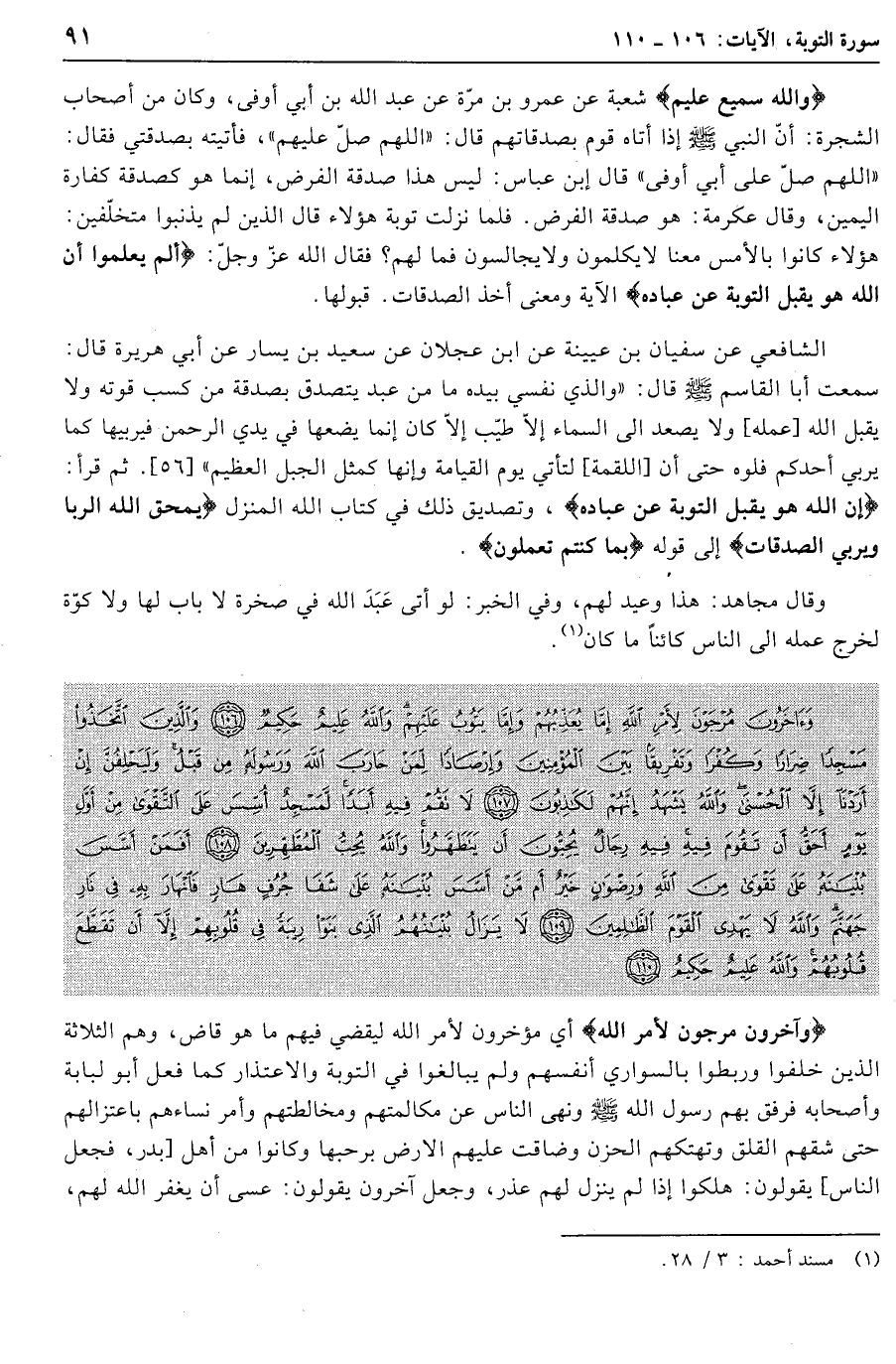 وَآخَرُونَ مُرْجَوْنَ لِأَمْرِ اللَّهِ إِمَّا يُعَذِّبُهُمْ وَإِمَّا يَتُوبُ عَلَيْهِمْ وَاللَّهُ عَلِيمٌ حَكِيمٌ (106) وَالَّذِينَ اتَّخَذُوا مَسْجِداً ضِراراً وَكُفْراً وَتَفْرِيقاً بَيْنَ الْمُؤْمِنِينَ وَإِرْصاداً لِمَنْ حارَبَ اللَّهَ وَرَسُولَهُ مِنْ قَبْلُ وَلَيَحْلِفُنَّ إِنْ أَرَدْنا إِلاَّ الْحُسْنى وَاللَّهُ يَشْهَدُ إِنَّهُمْ لَكاذِبُونَ (107) لا تَقُمْ فِيهِ أَبَداً لَمَسْجِدٌ أُسِّسَ عَلَى التَّقْوى مِنْ أَوَّلِ يَوْمٍ أَحَقُّ أَنْ تَقُومَ فِيهِ فِيهِ رِجالٌ يُحِبُّونَ أَنْ يَتَطَهَّرُوا وَاللَّهُ يُحِبُّ الْمُطَّهِّرِينَ (108) أَفَمَنْ أَسَّسَ بُنْيانَهُ عَلى تَقْوى مِنَ اللَّهِ وَرِضْوانٍ خَيْرٌ أَمْ مَنْ أَسَّسَ بُنْيانَهُ عَلى شَفا جُرُفٍ هارٍ فَانْهارَ بِهِ فِي نارِ جَهَنَّمَ وَاللَّهُ لا يَهْدِي الْقَوْمَ الظَّالِمِينَ (109) لا يَزالُ بُنْيانُهُمُ الَّذِي بَنَوْا رِيبَةً فِي قُلُوبِهِمْ إِلاَّ أَنْ تَقَطَّعَ قُلُوبُهُمْ وَاللَّهُ عَلِيمٌ حَكِيمٌ (110)