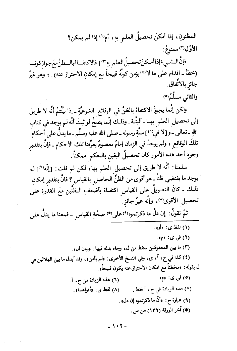 المظنون إذا أمكن تحصيل العلم به أم إذا لم يمكن الأول ممنوع فإن الشئ الذي أمكن تحصيل العلم به فالاكتفاء بالظن مع جواز كونه خطأ اقدام على ما لا يؤمن كونه قبيحا مع إمكان الاحتراز عنه وهو غير جائز بالاتفاق والثاني مسلم ولكن إنما يجوز الاكتفاء بالظن في الوقائع الشرعية إذا بينتم أنه لا طريق إلى تحصيل العلم بها ألبتة وذلك إنما يصح لو ثبت أنه لم يوجد في كتاب الله تعالى ولا في سنة رسوله ص ما يدل على احكام تلك الوقائع ولم يوجد في الزمان إمام معصوم يعرفنا تلك الأحكام فان بتقدير وجود أحد هذه الأمور كان تحصيل اليقين بالحكم ممكنا سلمنا إنه لا طريق إلى تحصيل العلم بها لكن لما قلت إنه لم يوجد ما يقتضى ظنا هو أقوى من الظن الحاصل بالقياس فان بتقدير إمكان ذلك كان التعويل على القياس اكتفاء بأضعف الظنين مع القدرة على تحصيل الأقوى وأنه غير جائز ثم نقول إن دل على ما ذكرتموه على صحة القياس فمعنا ما يدل على