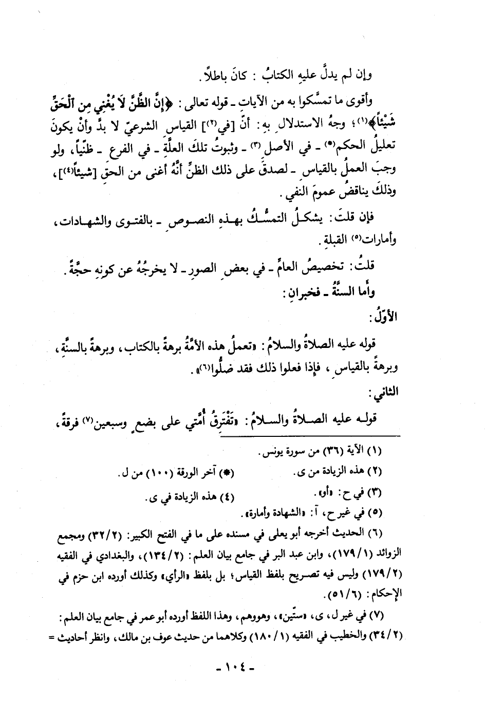 قوله عليه الصلاة والسلام تعمل هذه الأمة برهة بالكتاب وبرهة بالسنة وبرهة بالقياس فإذا فعلوا ذلك فقد ضلوا الثاني قوله عليه الصلاة والسلام تفترق أمتي على بضع وسبعين فرقة