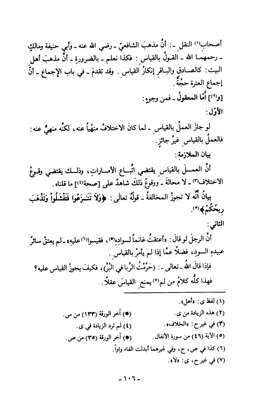 البيت كالصادق يكون والباقر إنكار القياس وقد تقدم في باب الإجماع أن إجماع العترة حجة وأما المعقول فمن وجوه الأول لو جاز العمل بالقياس لما كان الاختلاف منهيا عنه لكنه منهي عنه فالعمل بالقياس غير جائز بيان الملازمة أن العمل بالقياس يقتضى اتباع الأمارات وذلك يقتضى وقوع الاختلاف لا محالة ووقوع ذلك شاهد على صحة ما قلناه بيان أنه لا تجوز المخالفة قوله تعالى ولا تنازعوا فتفشلوا وتذهب ريحكم الثاني أن الرجل لو قال أعتقت غانما لسواده فقيسوا عليه لم يعتق سائر عبيده السود فضلا عما إذا لم يأمر بالقياس فإذا قال الله تعالى حرمت الربا في البر فكيف يجوز القياس عليه فهذا كله كلام من لم يمنع القياس عقلا