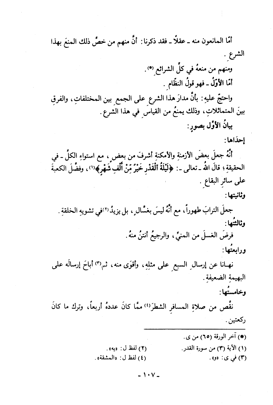أما الأول فهو قول النظام واحتج عليه بأن مدار هذا الشرع على الجمع بين المختلفات والفرق بين المتماثلات وذلك يمنع من القياس في هذا الشرع بيان الأول بصور إحداهما أنه جعل بعض الأزمنة والأمكنة أشرف من بعض مع استواء الكل في الحقيقة قال الله تعالى ليلة القدر خير من ألف شهر وفضل الكعبة على سائر البقاع وثانيتها جعل التراب طهورا مع أنه ليس بغسال مع بل يزيد في تشويه الخلقة وثالثتها فرض الغسل من المنى والرجيع أنتن منه ورابعتها نهانا عن إرسال السبع على مثله وأقوى منه ثم أباح إرساله على البهيمة الضعيفة وخامستها نقص من صلاة المسافر الشطر مما كان عدده أربعا وترك ما كان ركعتين