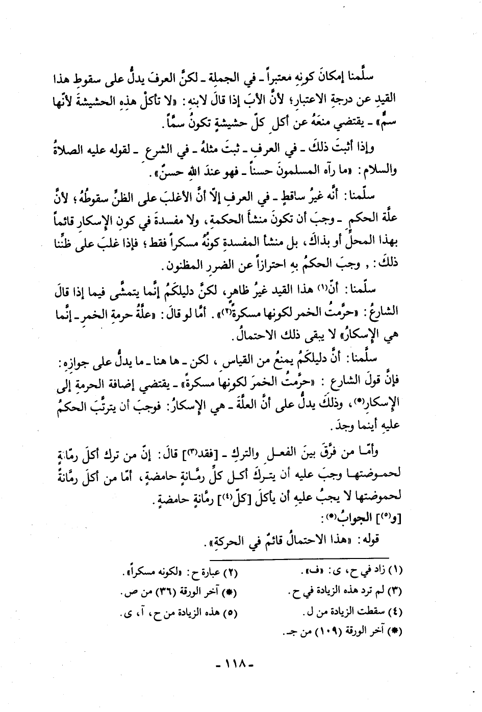 قد سلمنا إمكان كونه معتبرا في الجملة لكن العرف يدل على سقوط هذا القيد عن درجة الاعتبار لأن الأب إذا قال لأبنه لا تأكل هذه الحشيشة لأنا سم يقتضى منعه من أكل حشيشة تكون سما وإذا ثبت ذلك في العرف ثبت مثله في الشرع لقوله عليه الصلاة والسلام ما رأه المسلمون حسنا فهو عند الله حسن سلمنا أنه غير ساقط في العرف إلا أن الأغلب على الظن سقوطه لأن علة الحكم وجب أن تكون منشأ الحكمة ولا مفسدة في كون الإسكار قائما بهذا المحل أو بذاك بل منشأ المفسدة كونه مسكرا فقط فإذا غلب على ظننا ذلك وجب الحكم به احترازا عن الضرر المظنون سلمنا أن هذا القيد غير ظاهر لكن دليلكم إنما يتمشى فيما إذا قال الشارع حرمت الخمر لكونها مسكرة أما لو قال علة حرمة الخمر إنما هي الإسكار لا يبقى ذلك الاحتمال سلمنا أن دليلكم يمنع من القياس لكن هاهنا ما يدل على جوازه فإن قول الشارع حرمت الخمر لكونها مسكرة يقتضى إضافة الحرمة إلى الإسكار وذلك يدل على أن العلة هي الإسكار فوجب أن يترتب الحكم عليه أينما وجد