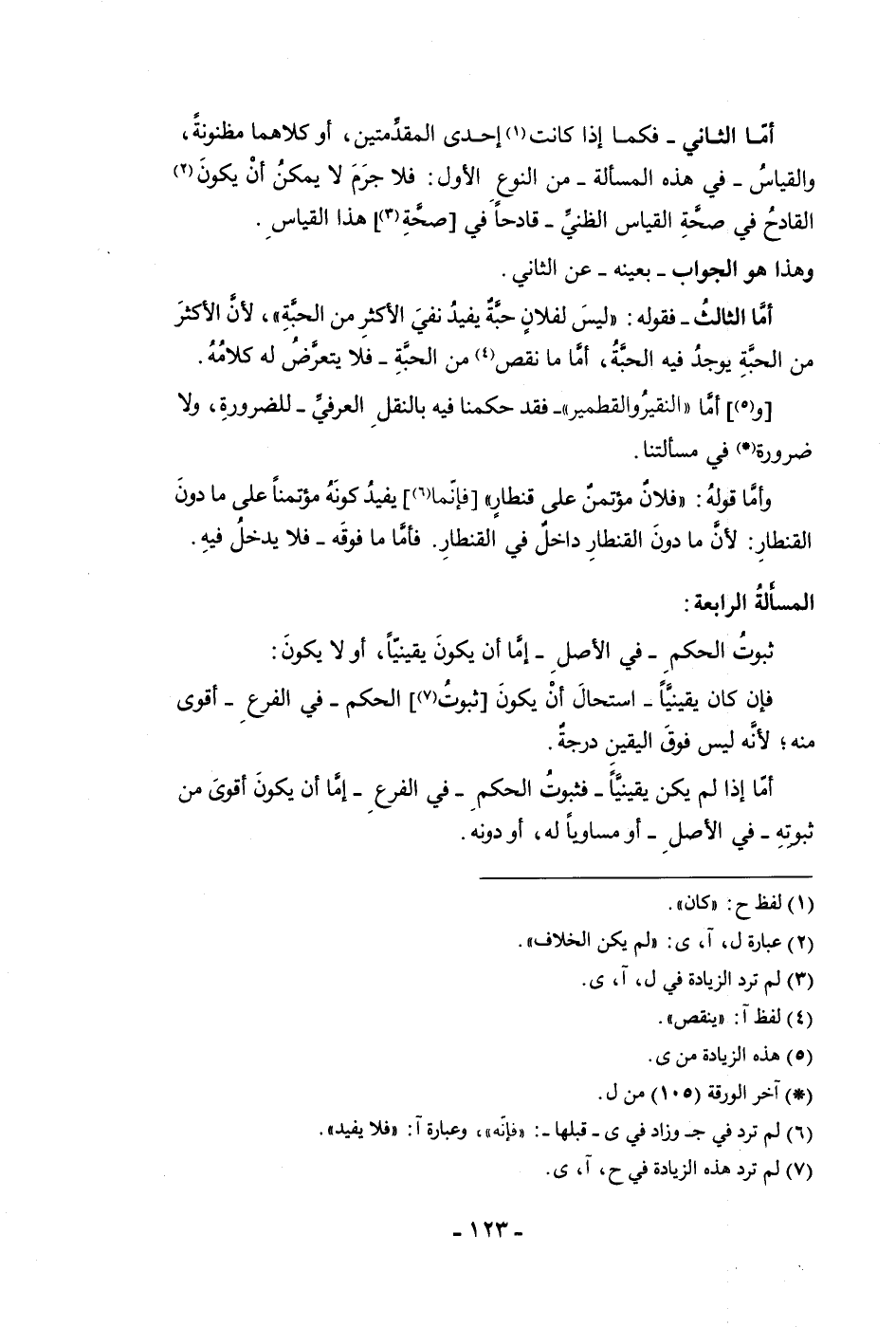 وهذا هو الجواب بعينه عن الثاني أما الثالث فقوله ليس لفلان حبة يفيد نفى الأكثر من الحبة لأن الأكثر من الحبة يوجد فيه الحبة أما ما نقص من الحبة فلا يتعرض له كلامه وأما النقير والقطمير فقد حكمنا فيه بالنقل العرفي للضرورة ولا ضرورة في مسألتنا وأما قوله فلان مؤتمن على قنطار فأنما يفيد كونه مؤتمنا على ما دون القنطار لأن ما دون القنطار داخل في القنطار فأما ما فوقه فلا يدخل فيه المسألة الرابعة ثبوت الحكم في الأصل إما أن يكون يقينيا أو لا يكون فإن كان يقينيا استحال أن يكون ثبوت الحكم في الفرع أقوى منه لأنه ليس فوق اليقين درجة أما إذا لم يكن يقينيا فثبوت الحكم في الفرع إما أن يكون أقوى من ثبوته في الأصل أو مساويا له أو دونه