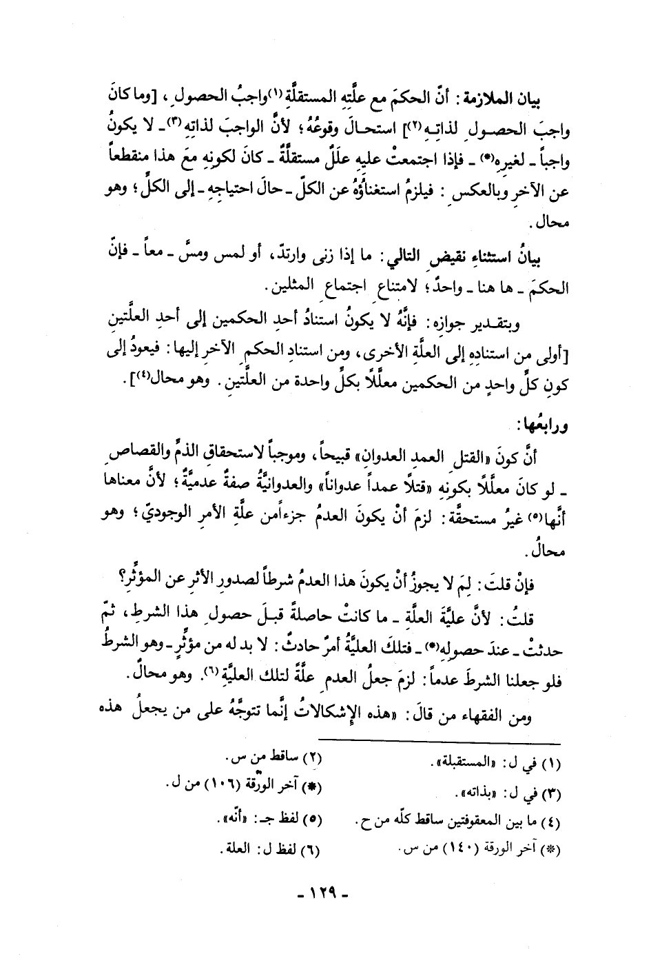 بيان الملازمة أن الحكم مع علته المستقلة واجب الحصول وما كان واجب الحصول لذاته استحال وقوعه لأن الواجب لذاته لا يكون واجبا لغيره فإذا اجتمعت عليه علل مستقلة كان لكونه مع هذا منقطعا عن الآخر وبالعكس فيلزم استغناؤه عن الكل حال احتياجه إلى الكل وهو محال بيان استثناء نقيض التالي ما إذا زنا وأرتد أو لمس ومس معا فإن الحكم هاهنا واحد لامتناع اجتماع المثلين وبتقدير جوازه فإنه لا يكون استناد أحد الحكمين إلى أحد العلتين أولى من استناده إلى العلة الأخرى ومن استناد الحكم الأخر إليها فيعود إلى كون كل واحد من الحكمين معللا بكل واحدة من العلتين وهو محال ورابعها أن كون القتل العمد العدوان قبيحا وموجبا لأستحقاق كل الذم والقصاص لو كان معللا بكونه قتلا عمدا عدوانا والعدوانية صفة عدمية لأن معناها انها غير مستحقة لزم أن يكون العدم جزء من علة الأمر الوجودي وهو محال فإن قلت لم لا يجوز أن يكون هذا العدم شرطا لصدور الأثر عن المؤثر قلت لأن عليه العلة ما كانت حاصلة قبل حصول هذا الشرط ثم حدثت عند حصوله فتلك العلية أمر حادث لابد له من مؤثر وهو الشرط فلو جعلنا الشرط عدما لزم جعل العدم علة لتلك العلية وهو محال ومن الفقهاء مقال هذه الإشكالات إنما تتوجه على من يجعل هذه