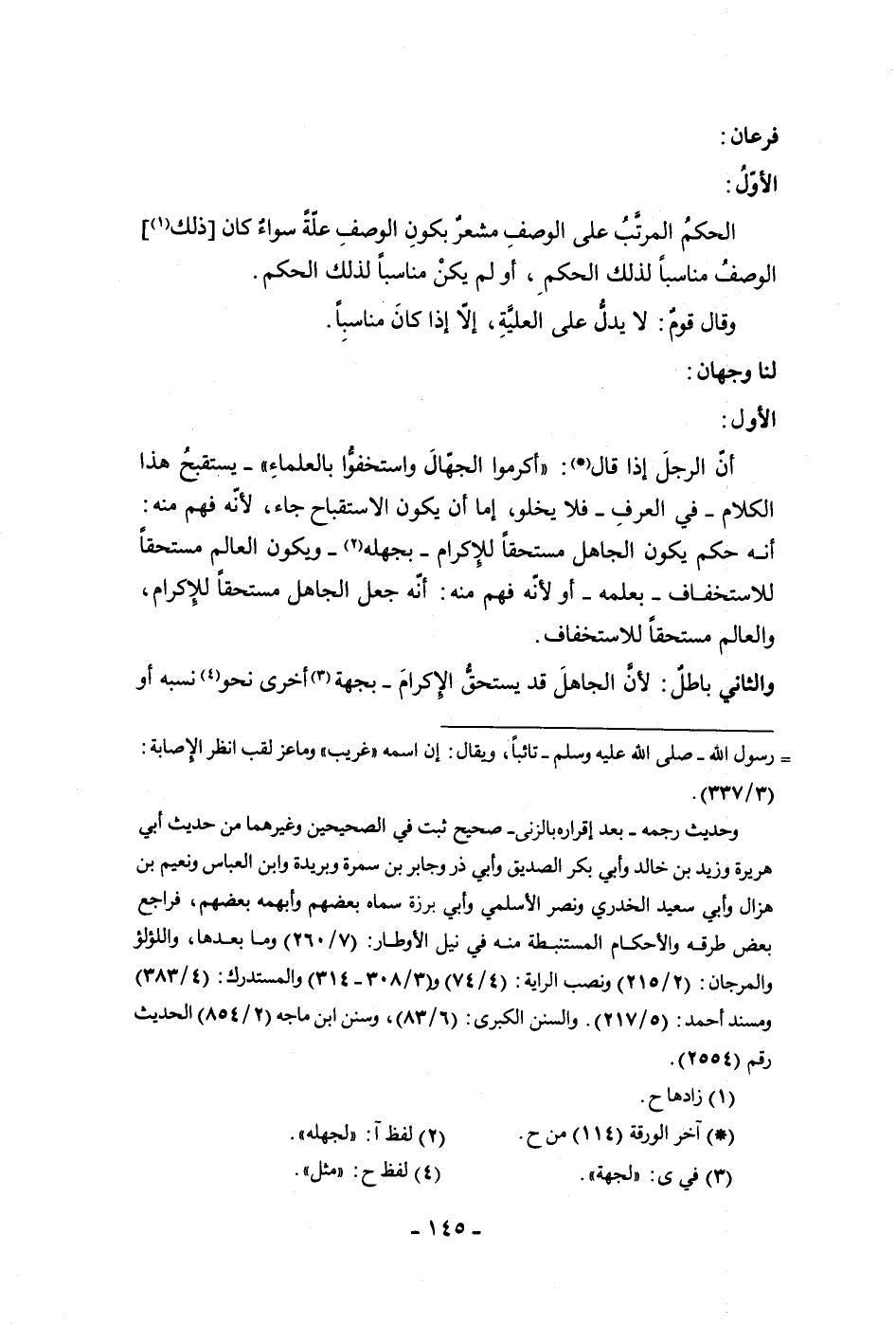لنا وجهان الأول أن الرجل إذا قال أكرموا الجهال واستخفوا بالعلماء يستقبح هذا الكلام في العرف فلا يخلو إما أن يكون الاستتباح جاء لأنه فهم منه أنه حكم يكون الجاهل مستحقا للإكرام بجهله ويكون العالم مستحقا للاستخفاف بعلمه أو لأنه فهم منه أنه جعل الجاهل مستحقا للإكرام والعالم مستحقا للاستخفاف والثاني باطل لأن الجاهل قد يستحق الإكرام بجهة أخرى نحو نسبه أو