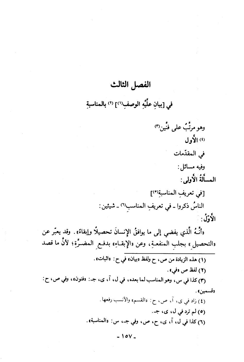 الفصل الثالث في بيان علية الوصف بالمناسبة وهو مرتب على فنين الأول في المقدمات وفيه مسائل المسألة الأولى في تعريف المناسبة