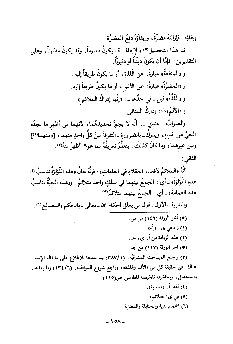 إبقاؤه فإزالته مضرة وإبقاؤه دفع المضرة ثم هذا التحصيل والإبقاء قد يكون معلوما وقد يكون مظنونا وعلى التقديرين فإما أن يكون دينيا أو دنيويا والمنفعة عبارة عن اللذة أو ما يكون طريقا إليه والمضرة عبارة عن الألم أو ما يكون طريقا إليه واللذة قيل في حدها إنها إدراك الملائم والألم إدراك المنافي والصواب عندي إنه لا يجوز تحديدهما لأنهما من أظهر ما يجده الحي من نفسه ويدرك بالضرورة التفرقة بين كل واحد منهما وبينهما وبين غيرهما وما كان كذلك يتعذر تعريفه بما هو أظهر منه الثاني أنه الملائم لأفعال العقلاء في العادات فإنه يقال هذه اللؤلؤة تناسب هذه اللؤلؤة أي الجمع بينهما في سلك واحد متلائم وهذه الجبة تناسب هذه العمامة أي الجمع بينهم متلائم والتعريف الأول قول من يعلل أحكام الله تعالى بالحكم والمصالح