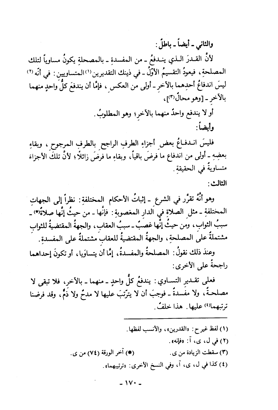 والثاني أيضا باطل لأن القدر الذي يندفع من المفسدة بالمصلحة يكو مساويا لتلك المصلحة فيعود التقسيم الأول في ذينك التقديرين المتساويين في أنه ليس اندفاع أحدهما بالآخر أولى من العكس فإما أن يندفع كل واحد منهما بالآخر وهو محال أو لا يندفع واحد منهما بالآخر وهو المطلوب وأيضا فليس اندفاع بعض أجزاء الطرف الراجح بالطرف المرجوح وبقاء بعضه أولى من اندفاع ما فرض باقيا وبقاء ما فرض زائلا لأن تلك الأجزاء متساوية في الحقيقة الثالث وهو أن تقرر في الشرع إثبات الأحكام المختلفة نظرا إلى الجهات المختلفة مثل الصلاة في الدار المغصوبة فأنها من حيث أنها صلاة سبب الثواب ومن حيث أنها غصب سبب العقاب والجهة المقتضية للثواب مشتملة على المصلحة والجهة المقتضية للعقاب مشتملة على المفسدة وعند ذلك نقول المصلحة والمفسدة إما أن يتساويا أو تكون إحداهما راجحة على الأخرى