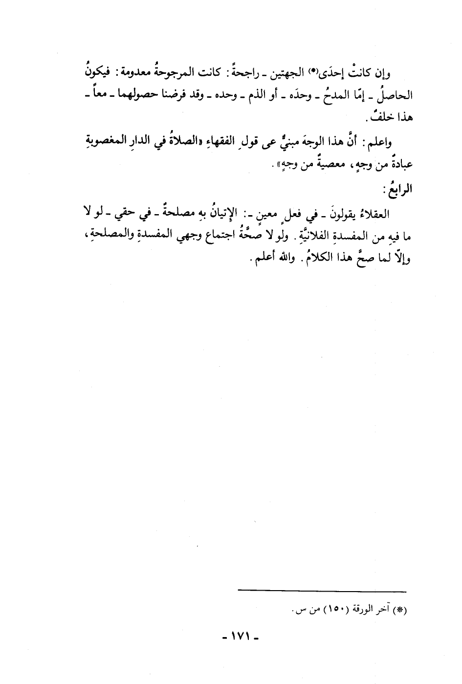 وإن كانت إحدى الجهتين راجحة كانت المرجوحة معدومة فيكون الحاصل إما المدح وحده أو الذم وحده وقد فرضنا حصولهما معا وهذا خلف واعلم أن هذا الوجه مبنى على قول الفقهاء الصلاة في الدار المغصوبة عبادة من وجه معصية من وجه الرابع العقلاء يقولون في فعل معين الإتيان به مصلحة في حقى لولا ما فيه من المفسدة الفلانية ولولا صحة إجتماع وجهى المفسدة والمصلحة وإلا لما صح هذا الكلام والله أعلم