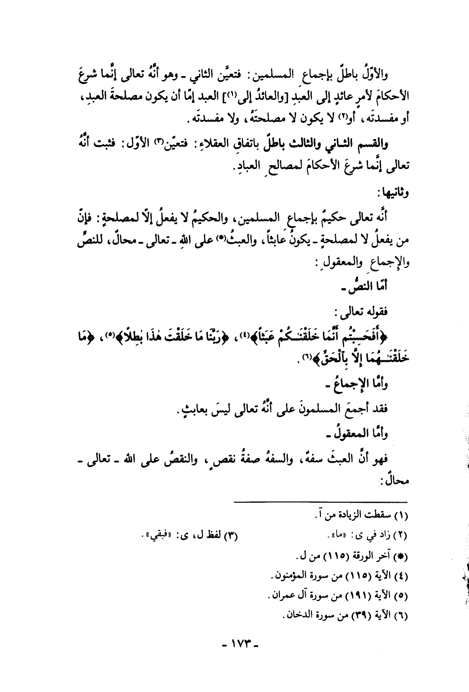 وأما الإجماع فقد أجمع المسلمون على أنه تعالى ليس بعابث وأما المعقول فهو أن العبث سفه والسفه صفة نقص والنقص على الله تعالى محال