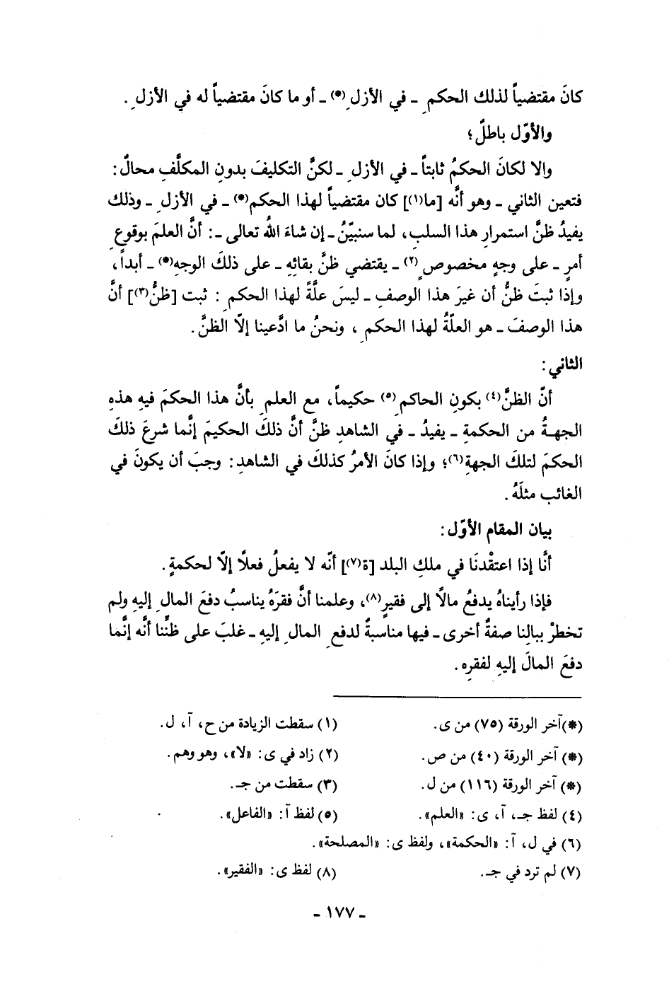 كان مقتضيا لذلك الحكم في الأزل أو ما كان مقتضيا له في الأزل والأول باطل وإلا لكان الحكم ثابتا في الأزل لكن التكليف بدون المكلف محال فتعين الثاني وهو أنه ما كان مقتضيا لهذا الحكم في الأزل وذلك يفيد ظن استمرار هذا السلب لما سنبين إن شاء الله تعالى أن العلم بوقوع أمر على وجه مخصوص يقتضى ظن بقائه على ذلك الوجه أبدا وإذا ثبت ظن أن غير هذا الوصف ليس علة لهذا الحكم ثبت ظن أن هذا الوصف هو العلة لهذا الحكم ونحن ما ادعينا إلا الظن الثاني
