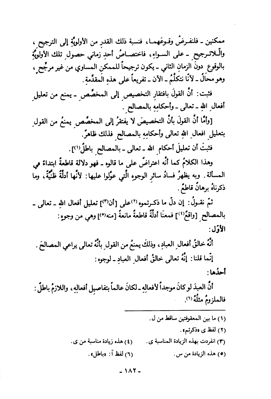بالوقوع دون الزمان الثاني يكون ترجيحا للممكن المساوى من غير مرجح وهو محال لأنا نتكلم الآن تفريعا على هذه المقدمة فثبت أن القول بأفتقار فإن التخصيص إلى المخصص يمنع من تعليل أفعال الله تعالى وأحكامه بالمصالح وأما أن القول بأن التخصص لا يفتقر إلى المخصص يمنع من القول بتعليل أفعال الله تعالى وأحكامه بالمصالح فذلك ظاهر فثبت أن تعليل أحكام الله تعالى بالمصالح باطل وهذا الكلام كما أنه اعتراض على ما قالوه فهو دلالة قاطعة ابتداء في المسألة وبه يظهر فساد سائر الوجوه التي عولوا عليها لأنها أدلة ظنية وما ذكرناه برهان قاطع ثم نقول إن دل على ما ذكرتموه على أن تعليل أفعال الله تعالى بالمصالح واقع فمعنا أدلة قاطعة مانعة منه وهي من وجوه الأول أنه خالق أفعال العباد وذلك يمنع من القول بأنه تعالى يراعي المصالح إنما قلنا إنه تعالى خالق أفعال العباد لوجوه أحدها أن العبد لو كان موجدا لأفعاله لكان عالما بتفاصيل أفعاله واللازم باطل فالملزوم مثله