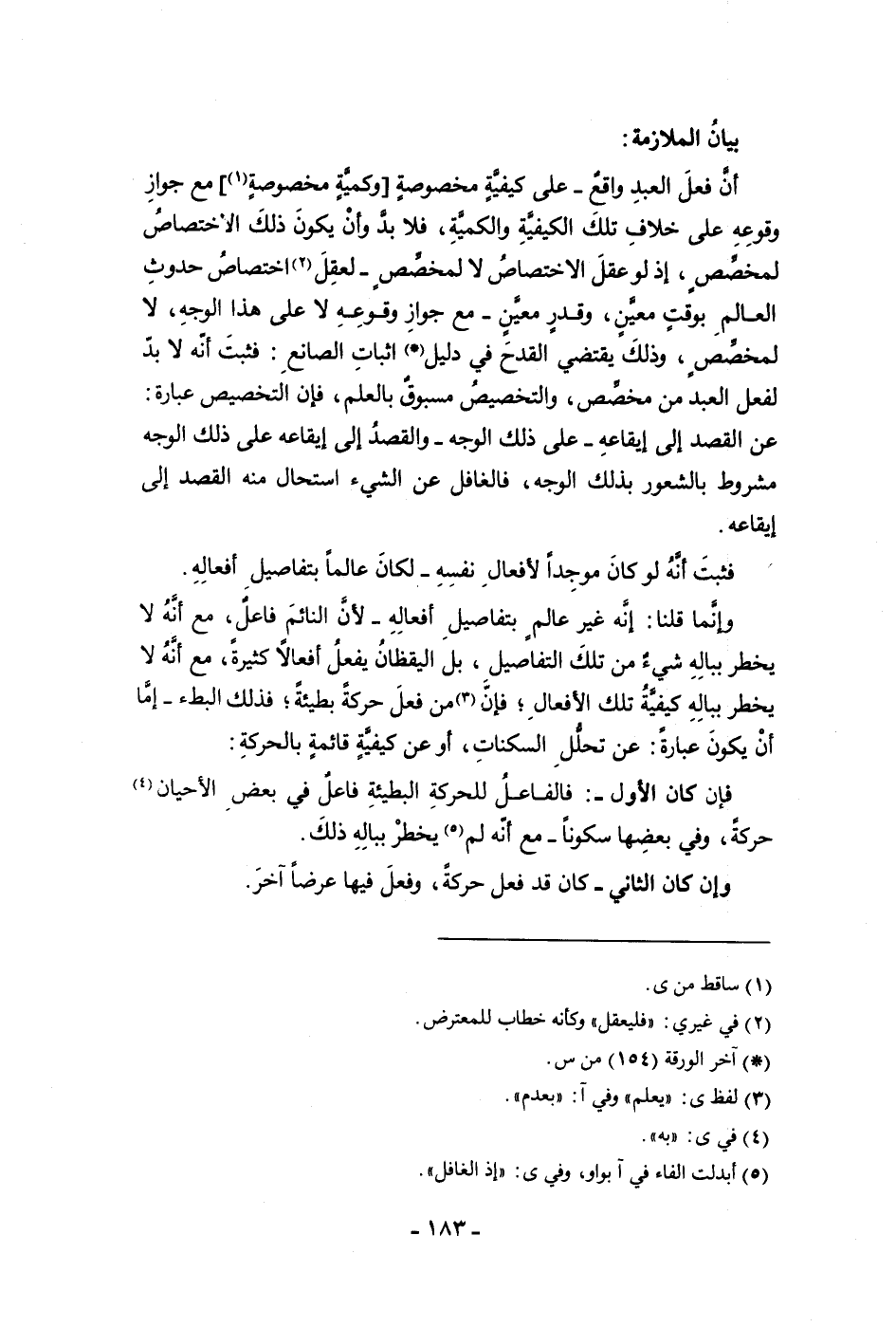 إذ لو عقل الاختصاص لا لمخصص لعقل اختصاص حدوث العالم بوقت معين وقدر معين مع جواز وقوعه لاعلى هذا الوجه لا لمخصص وذلك يقتضي القدح في دليل إثبات الصانع فثبت أنه لابد لفعل العبد من مخصص والتخصيص مسبوق بالعلم فإن التخصيص عبارة عن القصد إلى إيقاعه على ذلك الوجه والقصد إلى إيقاعه على ذلك الوجه مشروط بالشعور بذلك الوجه فالغافل ع الشئ استحال منه القصد إلى إيقاعه فثبت أنه لوه كان موجودا لأفعال نفسه لكان عالما بتفاصيل أفعاله وإنما قلنا إنه غير عالم بتفاصيل أفعاله لأن النائم فاعل مع انه لا يخطر بباله شئ من تلك التفاصيل بل اليقظان يفعل أفعالا كثيرة مع انه لا يخطر بباله كيفية تلك الأفعال فإن من فعل حركة بطيئة فذلك البطؤ إما أن يكون عبارة عن تحلل السكنات أو عن كيفية قائمة بالحركة فإن كان الأول فالفاعل للحركة البطيئة فاعل في بعض الأحيان حركة وفي بعضها سكونا مع أنه لم يخطر بباله ذلك وإن كان الثاني كان قد فعل حركة وفعل فيها عرضا آخر