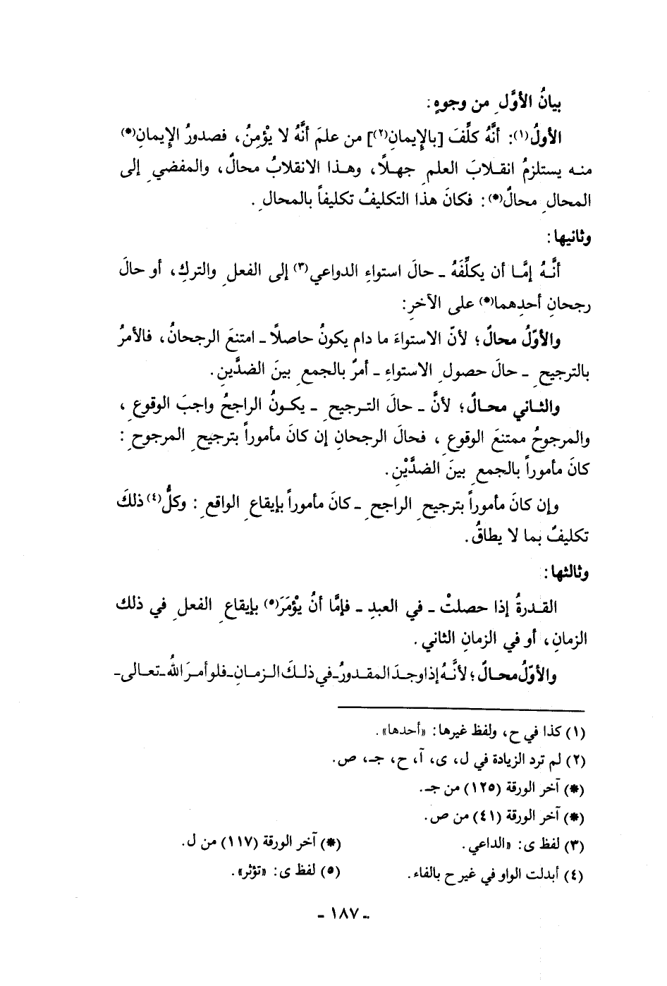 بيان الأول من وجوه الأول أنه كلف بالأيمان من علم أنه لا يؤمن فصدور الأيمان منه يستلزم انقلاب العلم جهلا وهذا الانقلاب محال والمفضى إلى المحال محال فكان هذا التكليف تكليفا بالمحال وثانيها أنه إما أن يكلفه حال استواء الدواعي إلى الفعل والترك أو حال رجحان أحدهما على الآخر والأول محال لأن الاستواء ما دام يكون حاصلا امتنع الرجحان فالأمر بالترجيح حال حصول الاستواء أمر بالجمع بين الضدين والثاني محال لأن حال الترجيح يكون الراجح واجب الوقوع والمرجوح ممتنع الوقوع فحال الرجحان إن كان مأمورا بترجيح المرجوح كان مأمورا بالجمع بين الضدين وإن كان مأمورا بترجيح الراجح كان مأمورا بإيقاع الواقع وكل ذلك تكليف بما لا يطاق وثالثها