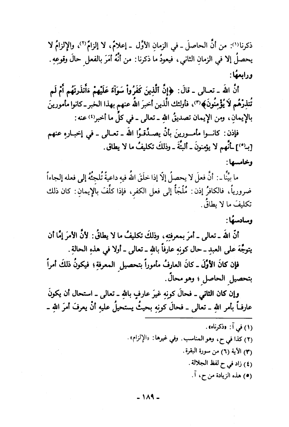 يحصل إلا في الزمان الثاني فيعود ما ذكرنا من إنه أمر بالفعل حال وقوعه ورابعها أن الله تعالى قال إن الذين كفروا سواء عليهم أأنذرتهم أم لم تنذرهم لا يؤمنون فأولئك الذين أخبر الله عنهم بهذا الخبر كانوا مأمورين بالإيمان ومن الإيمان تصديق الله تعالى في كل ما أخبر عنه فإذن كانوا مأمورين بأن يصدقوا الله تعالى في إخباره عنهم بأنهم لا يؤمنون ألبتة وذلك تكليف ما لا يطاق وخامسها ما بينا أن فعل العبد لا يحصل إلا إذا خلق الله فيه داعية تلجئه إلى فعله إلجاءا عمر ضروريا فالكافر إذن ملجأ إلى فعل الكفر فإذا كلف بالإيمان كان ذلك تكليف ما لا يطاق وسادسها أن الله تعالى أمر بمعرفته وذلك تكليف ما لا يطاق لأن الأمر إما أن يتوجه إلى العبد حال كونه عارفا بالله تعالى أولا في هذه الحالة فإن كان الأول كان العارف مأمورا بتحصيل المعرفة فيكون ذلك أمرا بتحصيل الحاصل وهو محال وإن كان الثاني فحال كونه غير عارف بالله تعالى استحال أن يكون عارفا بأمر الله تعالى فحال كونه بحيث يستحيل عليه أن يعرف أمر الله