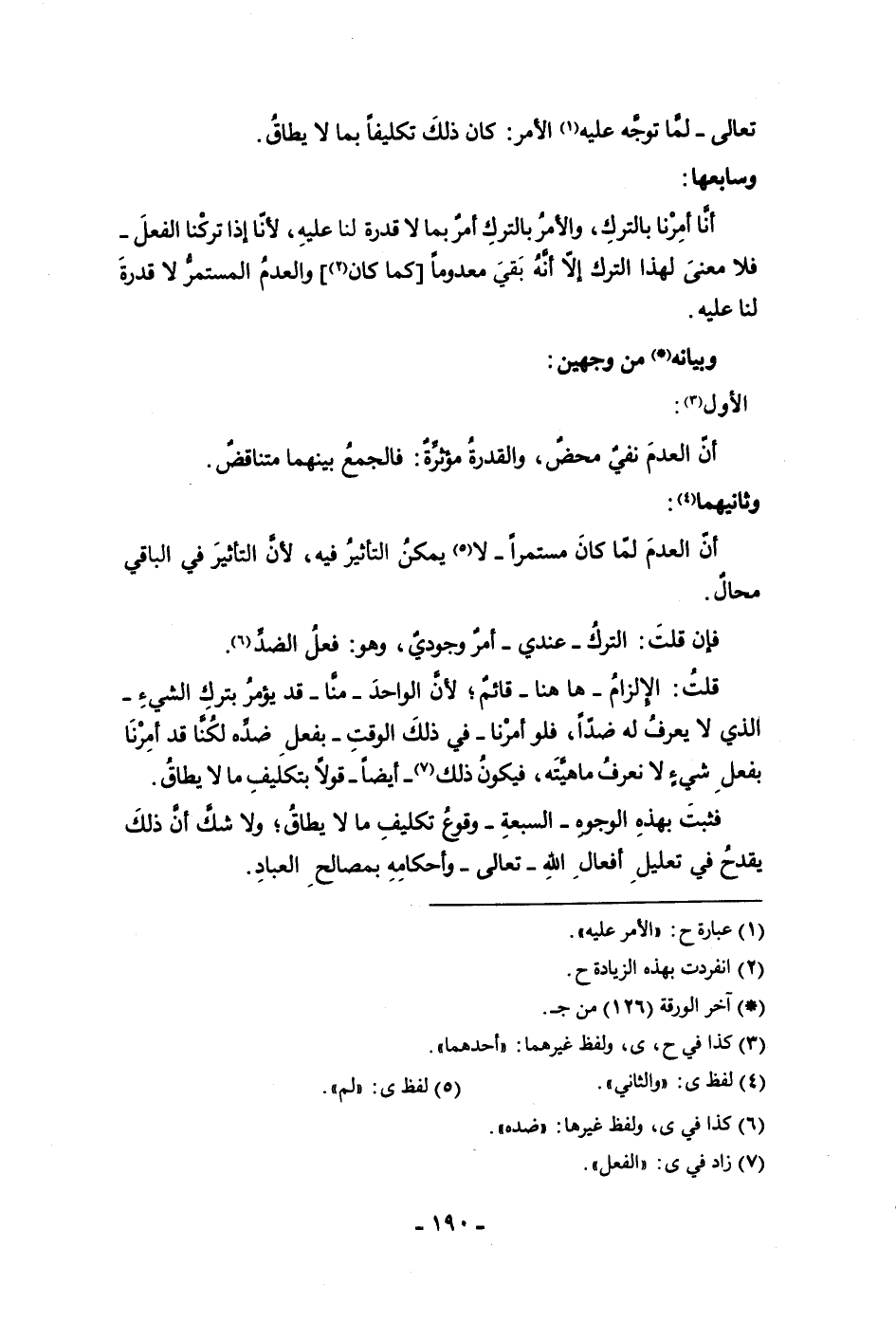 فلا معنى لهذا الترك إلا أنه بقى معدوما كما كان والعدم المستمر لا قدرة لنا عليه وبيانه من وجهين الأول أن العدم نفى محض والقدرة مؤثرة فالجمع بينهما متناقض وثانيهما أن العدم لما كان مستمرا لا يمكن التأثير فيه لأن التأثير في الباقي محال فإن قلت الترك عندي أمر وجودى وهو فعل الضد قلت الإلزام هاهنا قائم لأنا الواحد منا قد يؤمر بترك الشئ الذي لا يعرف للى النبي ضدا فلو أمرنا في ذلك الوقت بفعل ضده لكنا قد أمرنا بفعل شئ لا نعرف ماهيته فيكون ذلك أيضا قولا بتكليف مالا يطاق فثبت بهذه الوجوه السبعة وقوع تكليف مالا يطاق ولا شك أن ذلك يقدح في تعليل أفعال الله تعالى وأحكامه في مصالح العباد