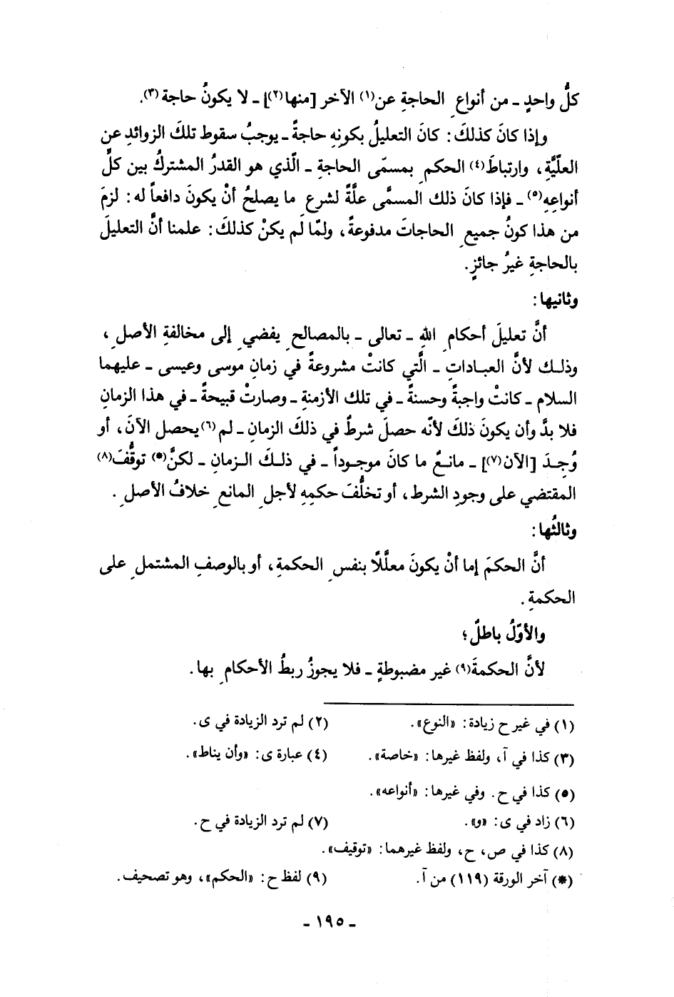 كل واحد من أنواع الحاجة عن الآخر منها لا يكون حاجة وإذا كان كذلك كان التعليل بكونه حاجة يوجب سقوط تلك الزوائد عن العلية وارتباط الحكم بمسمى الحاجة الذي هو القدر المشترك بين كل أنواعه فإذا كان ذلك المسمى علة لشرع ما يصلح أن يكون دافعا له لزم من هذا كون جميع الحاجات مدفوعة ولما لم يكن كذلك علمنا أن التعليل بالحاجة غير جائز وثانيها إن تعليل أحكام الله تعالى بالمصالح يفضى إلى مخالفة الأصل وذلك لأن العبادات التي كانت مشروعة في زمان موسى وعيسى عليهما السلام كانت واجبة وحسنة في تلك الأزمنة وصارت قبيحة في هذا الزمان فلابد وأن يكون ذلك لأ حصل شرط في ذلك الزمان لم يحصل الآن أو وجد الآن مانع ما كان موجودا في ذلك الزمان لكن توقف المقتضي على وجود الشرط أو تخلف حكمه لأجل المانع خلاف الأصل وثالثها أن الحكم إما أن يكون معللا بنفس الحكمة أو بالوصف المشتمل على الحكمة والأول باطل لأن الحكمة غير مضبوطة فلا يجوز ربط الأحكام بها