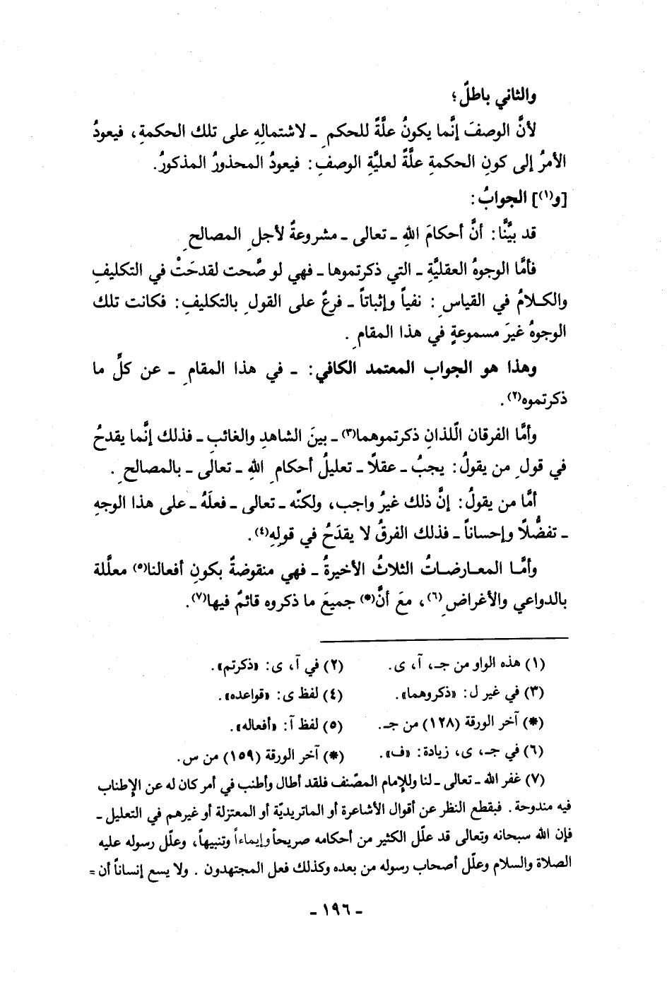 الأمر إلى كون الحكمة علة لعليه الوصف فيعود المحذور المذكور والجواب قد بينا أن أحكام الله تعالى مشروعة لأجل المصالح فأما الوجوه العقلية التي ذكرتموها فهي لو صحت لقدحت وإن في التكليف والكلام في القياس نفيا وإثباتا فرع على القول بالتكليف فكانت تلك الوجوه غير مسموعة في هذا المقام وهذا هو الجواب المعتمد الكافي في هذا المقام عن كل ما ذكرتموه وأما الفرقان اللذان ذكرتموهما بيبن الشاهد والغائب فذلك إنما يقدح في قول من يقول يجب عقلا تعليل أحكام الله تعالى بالمصالح أما من يقول إن ذلك غير واجب ولكنه تعالى فعله على هذا الوجه تفضلا وإحسانا فذلك الفرق لا يقدح في قوله وأما المعارضات الثلاث الأخيرة فهي منقوضة بكون أفعالنا معللة بالدواعي والأغراض مع أن جميع ما ذكروه قائم فيها