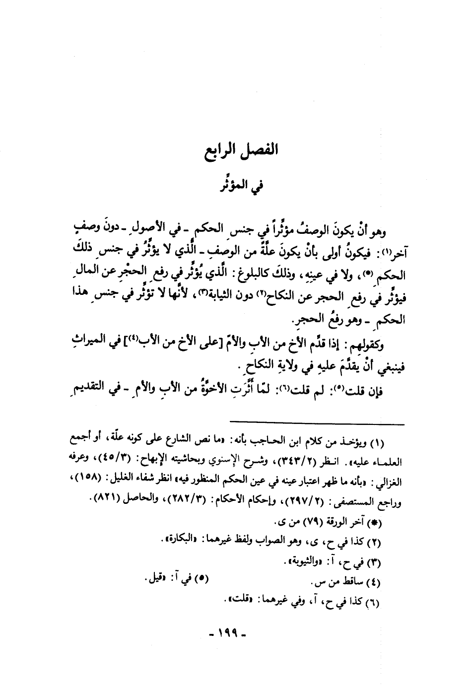الفصل الرابع في المؤثر وهو أن يكون الوصف مؤثرا في جنس الحكم في الأصول دون وصف آخر فيكون أولى بأن يكون علة من الوصف الذي لا يؤثر في جنس ذلك الحكم ولا في عينه وذلك كالبلوغ الذي يؤثر في رفع الحجر عن المال فيؤثر في رفع الحجر عن النكاح دون الثيابة لأنها لا تؤثر في جنس هذا الحكم وهو رفع الحجر