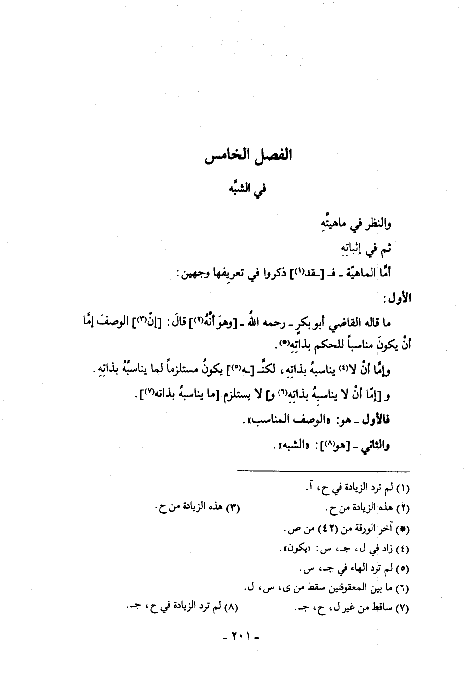 الفصل الخامس في الشبه والنظر في ماهيته ثم في إثباته أما الماهية فقد ذكروا في تعريفها وجهين الأول ما قاله القاضي أبو بكر رحمه الله وهو أنه قال إن الوصف إما أن يكون مناسبا للحكم بذاته وإما أن لا يناسبه بذاته لكنه يكون مستلزما لما يناسبه بذاته وإما أن لا يناسبه بذاته ولا يستلزم ما يناسبه بذاته فالأول هو الوصف المناسب والثاني هو الشبه