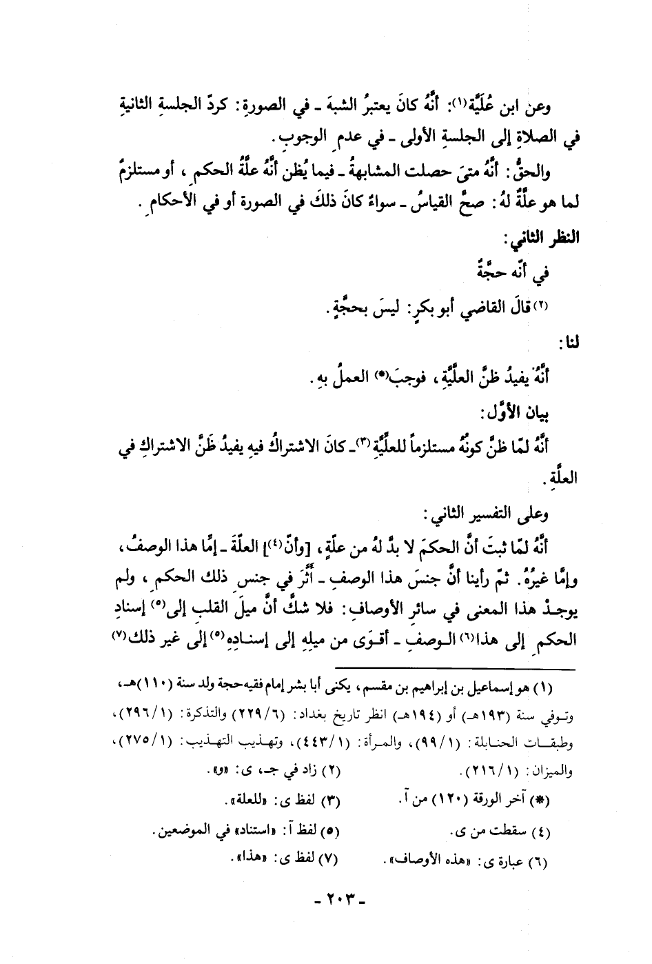 وعن ابن علية أنه كان يعتبر الشبه في الصورة كرد الجلسة الثانية في الصلاة إلى الجلسة الأولى في عدم الوجوب والحق أنه متى حصلت المشابهة فيما يظن أنه علة الحكم أو مستلزم لما هو علة له صح القياس سواء كان ذلك في الصورة أو في الأحكام