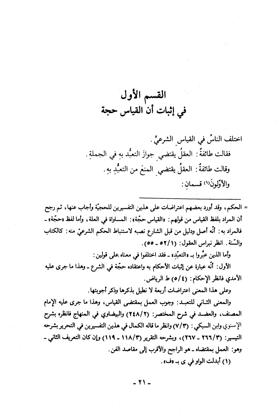 القسم الأول في إثبات أن القياس حجة اختلف الناس في القياس الشرعي فقلت طائفة العقل يقتضى جواز التعبد به في الجملة وقالت طائفة العقل يقتضي المنع من التعبد به والأولون قسمان