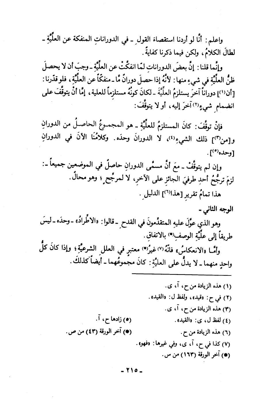وأعلم أن لو أردنا استقصاء القول في الدورانات المنفكة عن العلية لطال الكلام ولكن فيما ذكرنا كفاية