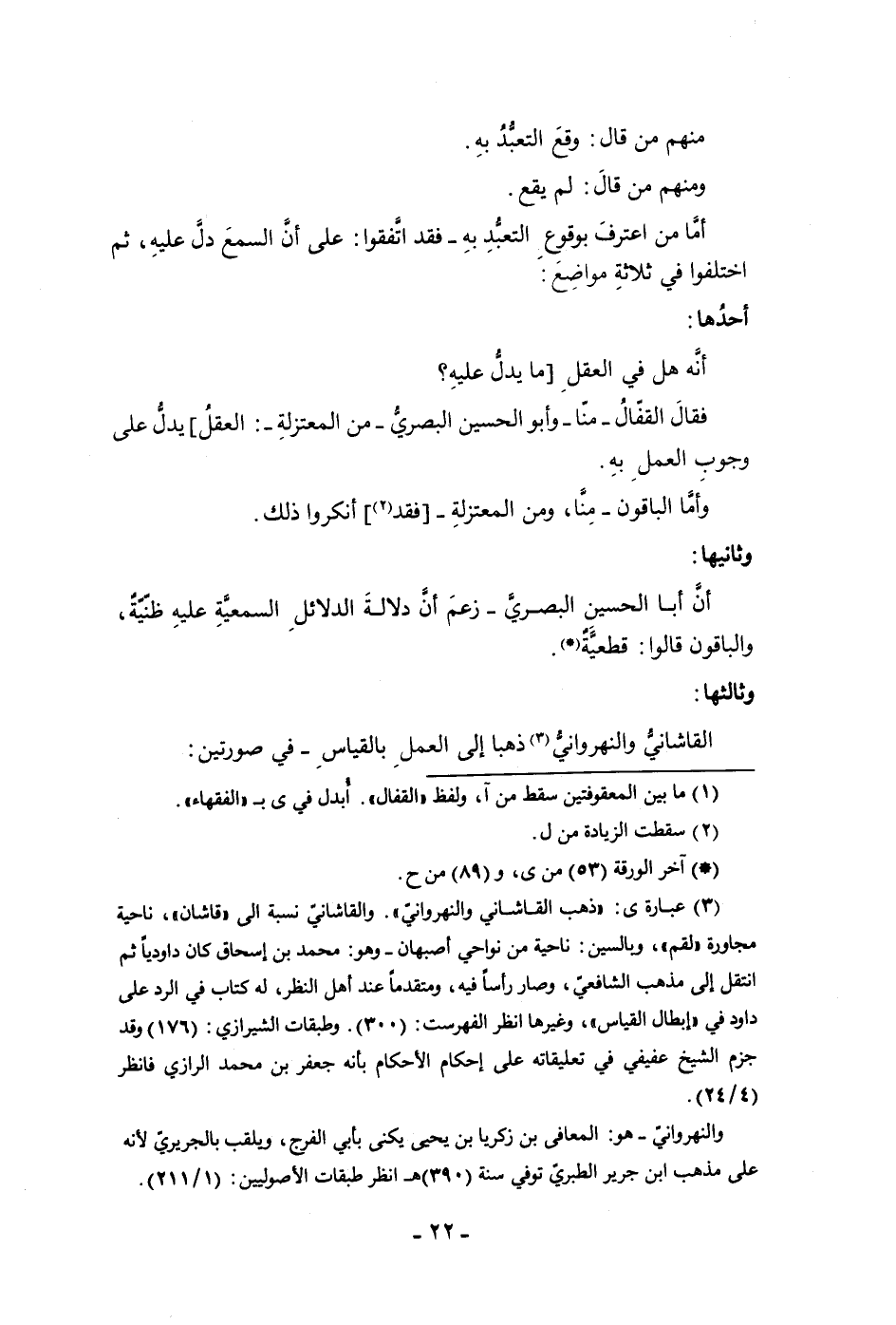 منهم من قال وقع التعبد به ومنهم من قال لم يقع أما من اعترف بوقوع التعبد به فقد اتفقوا على أن السمع دل عليه ثم اختلفوا في ثلاثة مواضع أحدها أنه هل في العقل ما يدل عليه فقال القفال منا وأبو الحسين والبصرى من المعتزلة العقل يدل على وجوب العمل به وأما الباقون منا ومن المعتزلة فقد أنكروا ذلك وثانيها أن أبا الحسين البصري زعم أن دلالة الدلائل السمعية عليه ظنية والباقون قالوا قطعية وثالثها القاشاني والنهرواني ذهبا إلى العمل بالقياس في صورتين