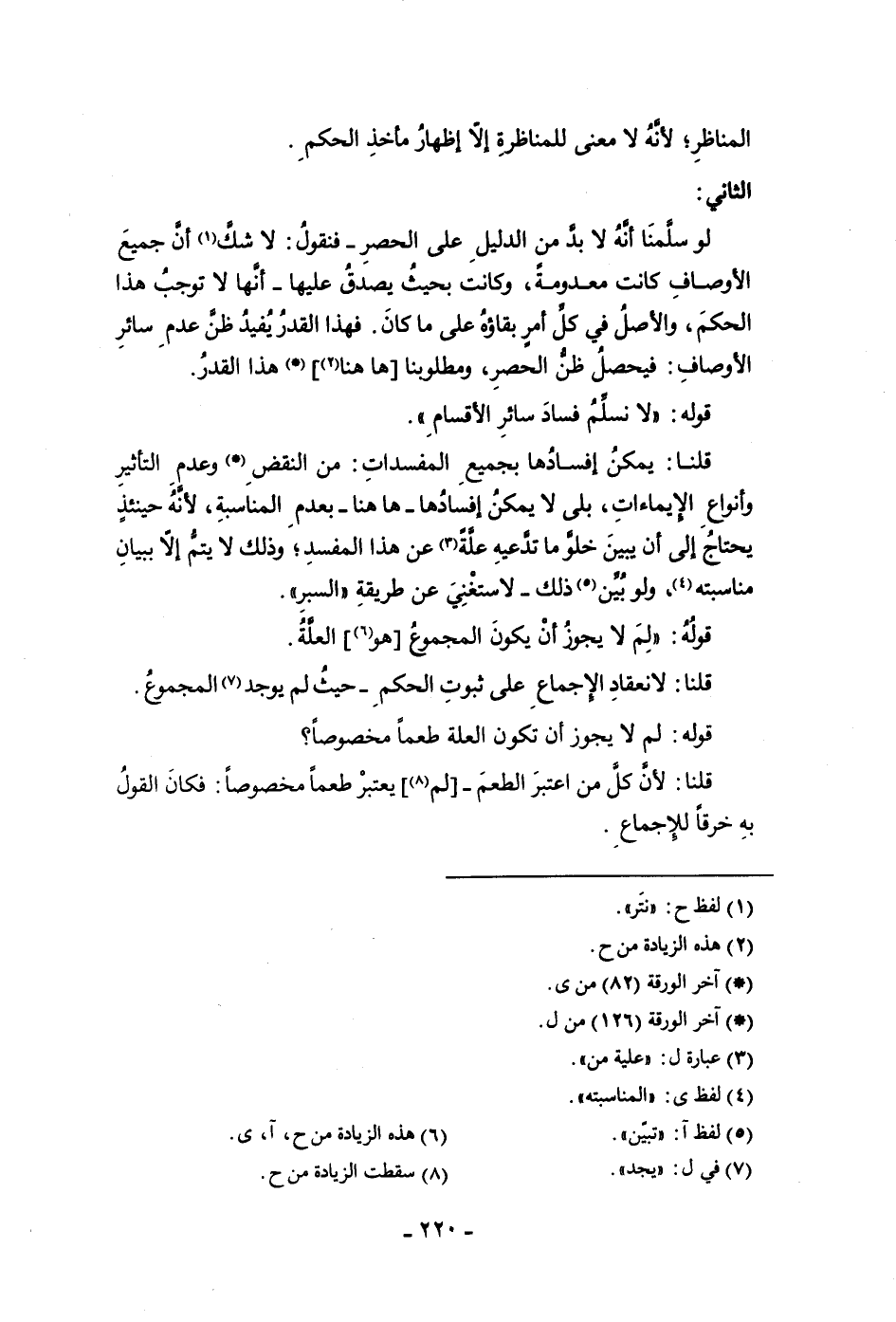 المجتهد وجب أن يكون الأمر كذلك في حق المناظر لأنه لا معنى للمناظرة إلا إظهار مأخذ الحكم الثاني لو سلمنا أنه لا بد من الدليل على الحصر فنقول لا شك أن جميع الأوصاف كانت معدومة وكانت بحيث يصدق عليها أنها لا توجب هذا الحكم والأصل في كل أمر بقاؤه على ما كان فهذا القدر يفيد ظن عدم سائر الأوصاف فيحصل ظن الحصر ومطلوبنا هاهنا هذا القدر قوله لا نسلم فساد سائر الأقسام قلنا يمكن إفسادها بجميع المفسدات من النقض وعدم التأثير وأنواع الأيماءات إن بلى لا يمكن إفسادها هاهنا بعدم المناسبة لأنه حينئذ يحتاج إلى أن يبين خلو ما تدعيه علة عن هذا المفسد وذلك لا يتم إلا ببيان مناسبته ولو بين ذلك لاستغنى عن طريقة السبر قوله لم لا يجوز أن يكون المجموع هو العلة