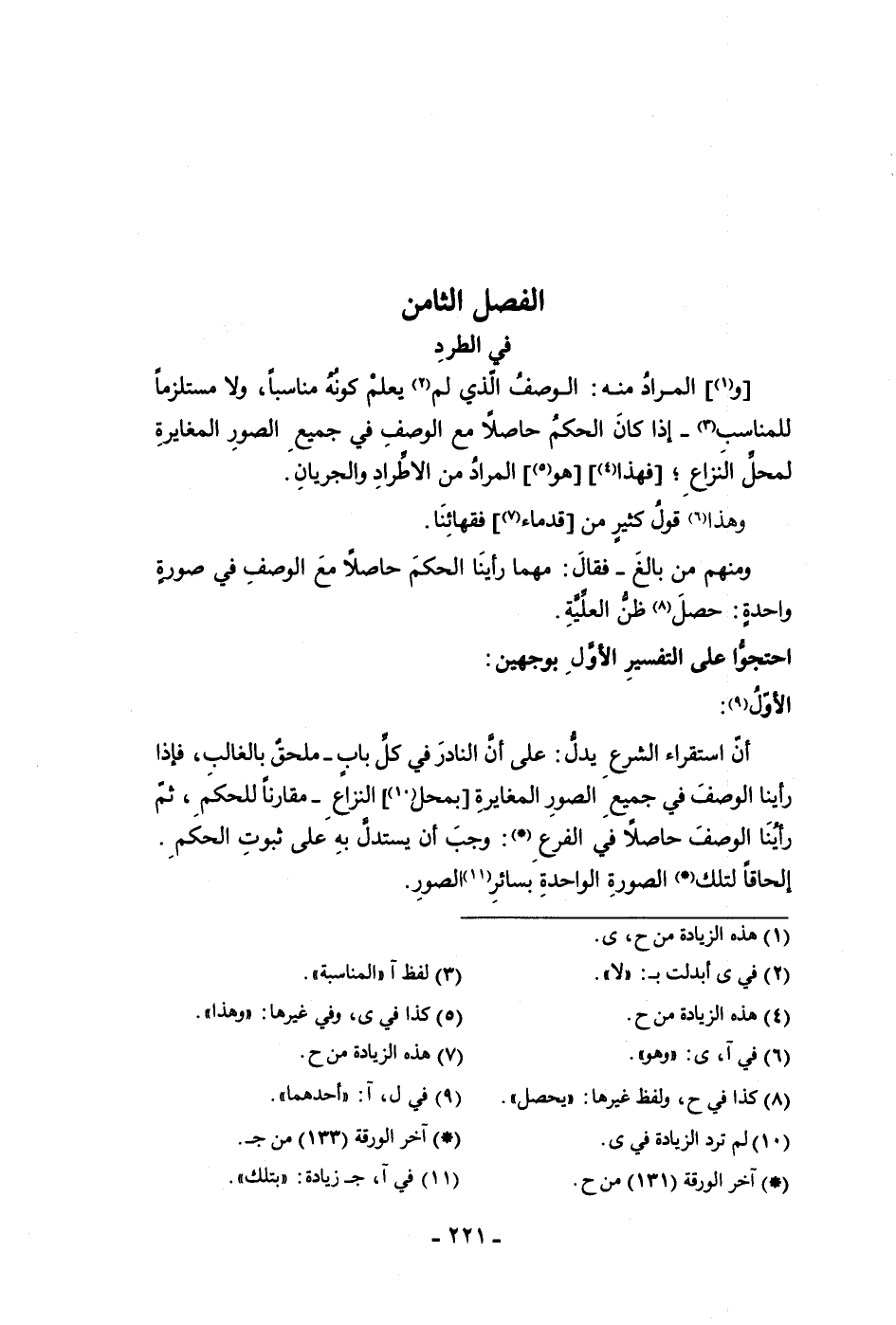 الفصل الثامن في الطرد والمراد منه الوصف الذي لم يعلم كونه مناسبا ولا مستلزما للمناسب إذا كان الحكم حاصلا مع الوصف في جميع الصور المغايرة لمحل النزاع فهذا هو المراد من الاطراد والجريان وهذا قول كثير من قدماء فقهائنا ومنهم من بالغ فقال مهما رأينا الحكم حاصلا مع الوصف في صورة واحدة حصل ظن العلية احتجوا على التفسير الأول بوجهين الأول أن استقراء الشرع يدل على أن النادر في كل باب ملحق بالغالب فإذا رأينا الوصف في جميع الصور المغايرة بمحل النزاع مقارنا للحكم ثم رأينا الوصف حاصلا في الفرع وجب أن يستدل به على ثبوت الحكم إلحاقا لتلك الصورة الواحدة بسائر الصور