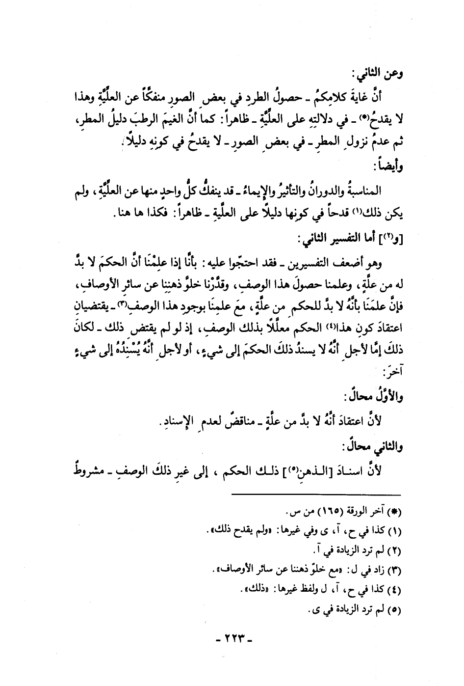 يكن ذلك قدحا في كونها دليلا على العلية ظاهرا فكذا هاهنا وأما التفسير الثاني وهو أضعف التفسيرين فقد احتجوا عليه بأنا إذا علمنا أن الحكم لابد له من علة وعلمنا حصول هذا الوصف وقدرنا خلو ذهننا عن سائر الأوصاف فإن علمنا بأنه لا بد للحكم من علة مع علمنا بوجود هذا الوصف يقتضيان اعتقاد كون هذا الحكم معللا بذلك الوصف اذا لو لم يقتض ذلك لكان ذلك إما لأجل أنه لا يسند ذلك الحكم إلى شئ أو لأجل أنه يسنده إلى شئ أخر والأول محال لأن اعتقاد أنه لابد من علة متناقض لعدم الاسناد والثاني محال لأن اسناد الذهن ذلك الحكم إلى غير ذلك الوصف مشروط