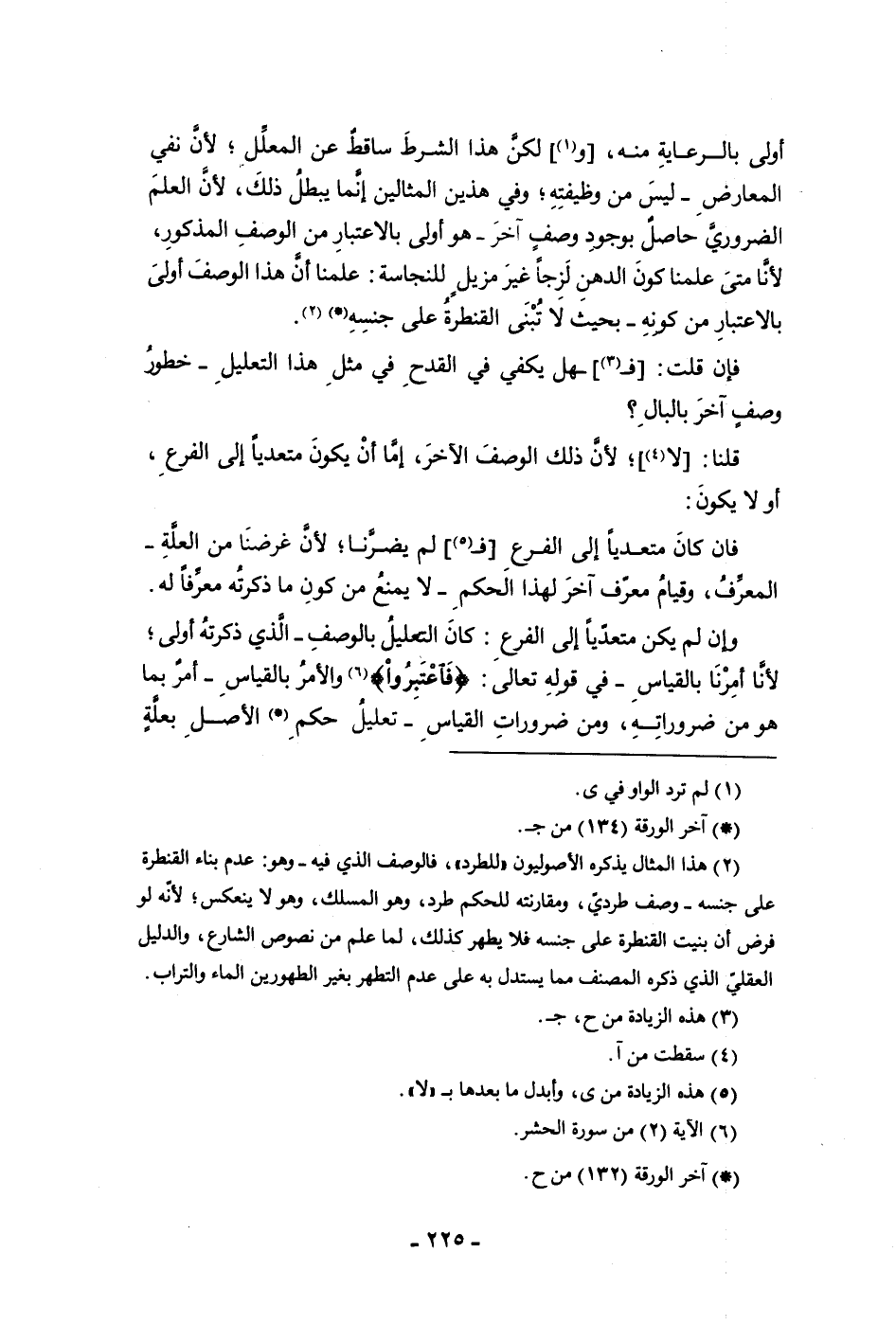 أولى بالرعاية منه ولكن هذا الشرط ساقط عن المعلل لأن نفى المعارض ليس من وظيفته وفي هذين المثالين إنما يبطل ذلك لأن العلم الضروري حاصل بوجود وصف آخر هو أولى بالاعتبار من الوصف المذكور لأنا متى علمنا كون الدهن لزجا غير مزيل للنجاسة علمنا أن هذا الوصف أولى بالاعتبار من كونه بحيث لا تبنى القنطرة على جنسه فإن قلت فهل يكفى في القدح في مثل هذا التعليل خطور وصف آخر بالبال قلنا لا لأن ذلك الوصف الآخر إما أن يكون متعديا إلى الفرع أو لا يكون فإن كان متعديا إلى الفرع فلم يضرنا لأن غرضنا من العلة المعرف وقيام معرف آخر لهذا الحكم لا يمنع من كون ما ذكرته معرفا له وإن لم يكن متعديا إلى الفرع كان التعليل بالوصف الذي ذكرته أولى