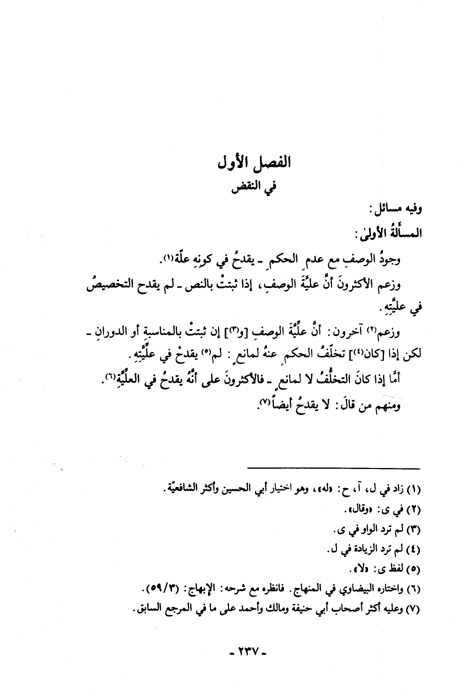 الفصل الأول في النقض وفيه مسائل المسألة الأولى وجود الوصف مع عدم الحكم يقدح في كونه علة وزعم الأكثرون أن علية الوصف إذا ثبتت بالنص لم يقدح التخصيص في عليته وزعم آخرون أن علية الوصف وإن ثبتت بالمناسبة أو الدوران لكن إذا كان تخلف الحكم عنه لمانع لم يقدح في عليته أما إذا كان التخلف لا لمانع فالأكثرون على أنه يقدح في العلية ومنهم من قال لا يقدح أيضا