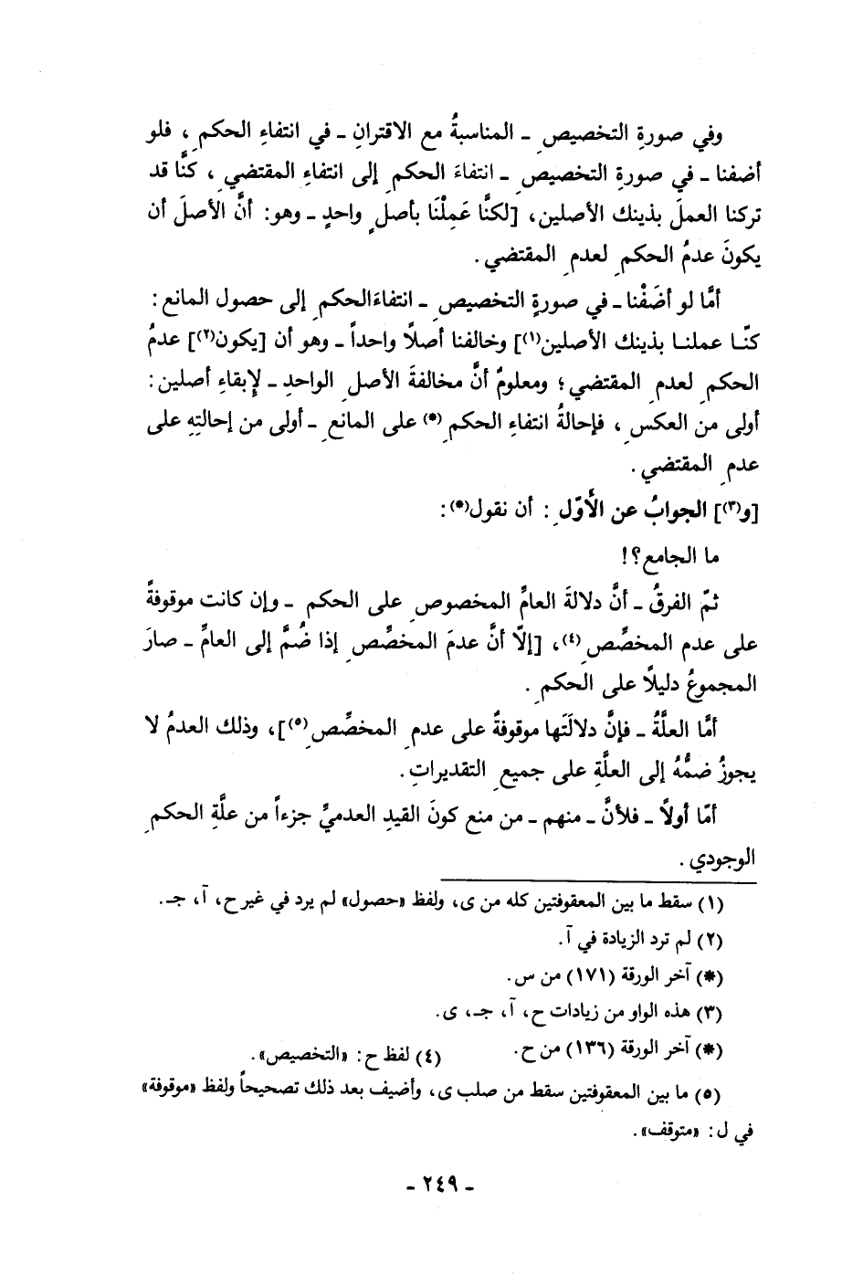 وفي صورة التخصيص المناسبة مع الاقتران في انتفاء الحكم فلو أضفنا في صورة التخصيص انتفاء الحكم إلى انتفاء المقتضى كنا قد تركنا العمل بذينك الأصلين لكنا عملنا بأصل واحد وهو أن الأصل أن يكون عدم الحكم لعدم المقتضى أما لو أضفنافي صورة التخصيص انتفاء الحكم إلى حصول المانع كنا عملنا بذينك الأصلين وخالفنا أصلا واحدا وهو أن يكون عدم الحكم لعدم المقتضى ومعلوم أن مخالفة الأصل الواحد لإبقاء أصلين أولى من العكس فإحالة انتفاء الحكم على المانع أولى من إحالته على عدم المقتضى والجواب عن الأول أن نقول ما الجامع ثم الفرق أن دلالة العام المخصوص على الحكم وإن كانت موقوفة على عدم المخصص إلا أن عدم المخصص إذا ضم إلى العام صار المجموع دليلا على الحكم أما العلة فإن دلالتها موقوفة على عدم المخصص وذلك العدم لا يجوز ضمه إلى العلة على جميع التقديرات أما أولا فلأن منهم من منع كون القيد العدمي جزءا من علة الحكم الوجودى