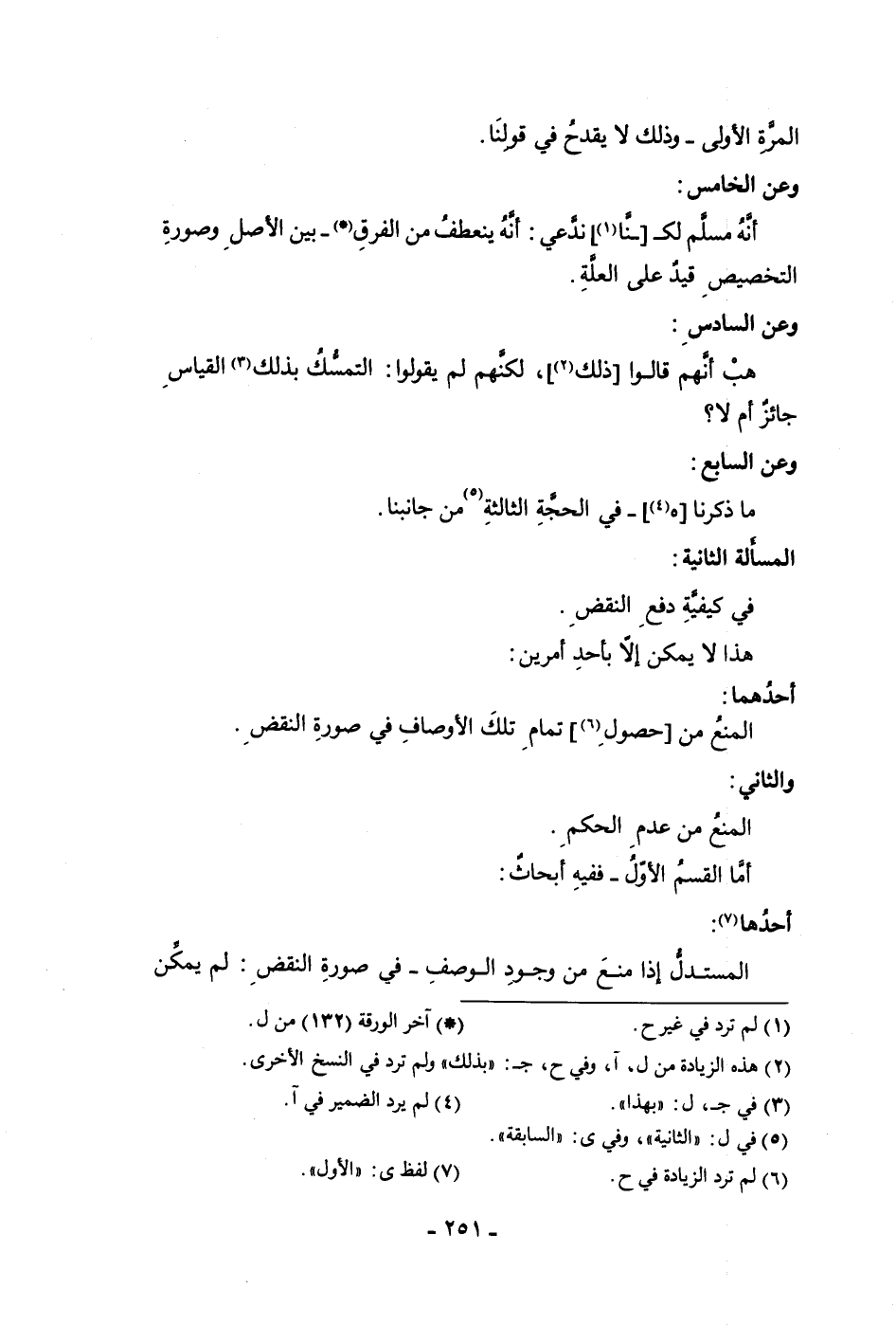 هب أنهم قالوا ذلك لكنهم لم يقولوا التمسك بذلك القياس جائز أم لا وعن السابع ما ذكرناه في الحجة الثالثة من جانبنا المسألة الثانية في كيفية دفع النقض هذا لا يمكن إلا بأحد أمرين أحدها المنع من حصول تمام تلك الأوصاف في صورة النقض والثاني المنع من عدم الحكم أما القسم الأول ففيه أبحاث أحدها المستدل إذا منع من وجود الوصف في صورة النقض لم يمكن