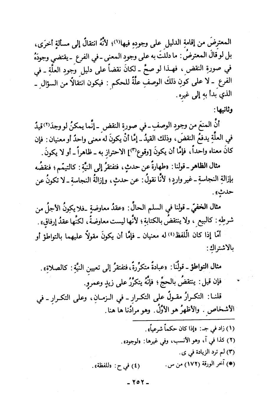في العلة يدفع النقض وذلك القيد إما أن يكون له معنى واحد أو معنيان فإن كان معناه واحدا فإما أن يكون وقوع الاحتراز به ظاهرا أو لا يكون مثال الظاهر قولنا طهارة عن حدث فتفتقر إلى النية كالتيمم فنقضه بإزالة النجاسة غير وارد لأنا نقول عن حدث وإزالة النجاسة لا تكون عن حدث مثال الخفي قولنا في السلم الحال عقد معاوضة فلا يكون الأجل من شرطه كالبيع ولا ينتقض بالكتابة لأنها ليست معاوضة لكنها عقد إرفاق أما إذا كان اللفظ له معنيان فإما أن يكون مقولا عليهما بالتواطؤ أو بالاشتراك مثال التواطؤ قولنا عبادة متكررة فتفتقر إلى تعيين النية كالصلاة فإن قيل ينتقض بالحج فإنه يتكرر على زيد وعمرو قلنا التكرار مقول على التكرار في الزمان وعلى التكرار في الأشخاص والأظهر هو الأول وهو مرادنا هاهنا