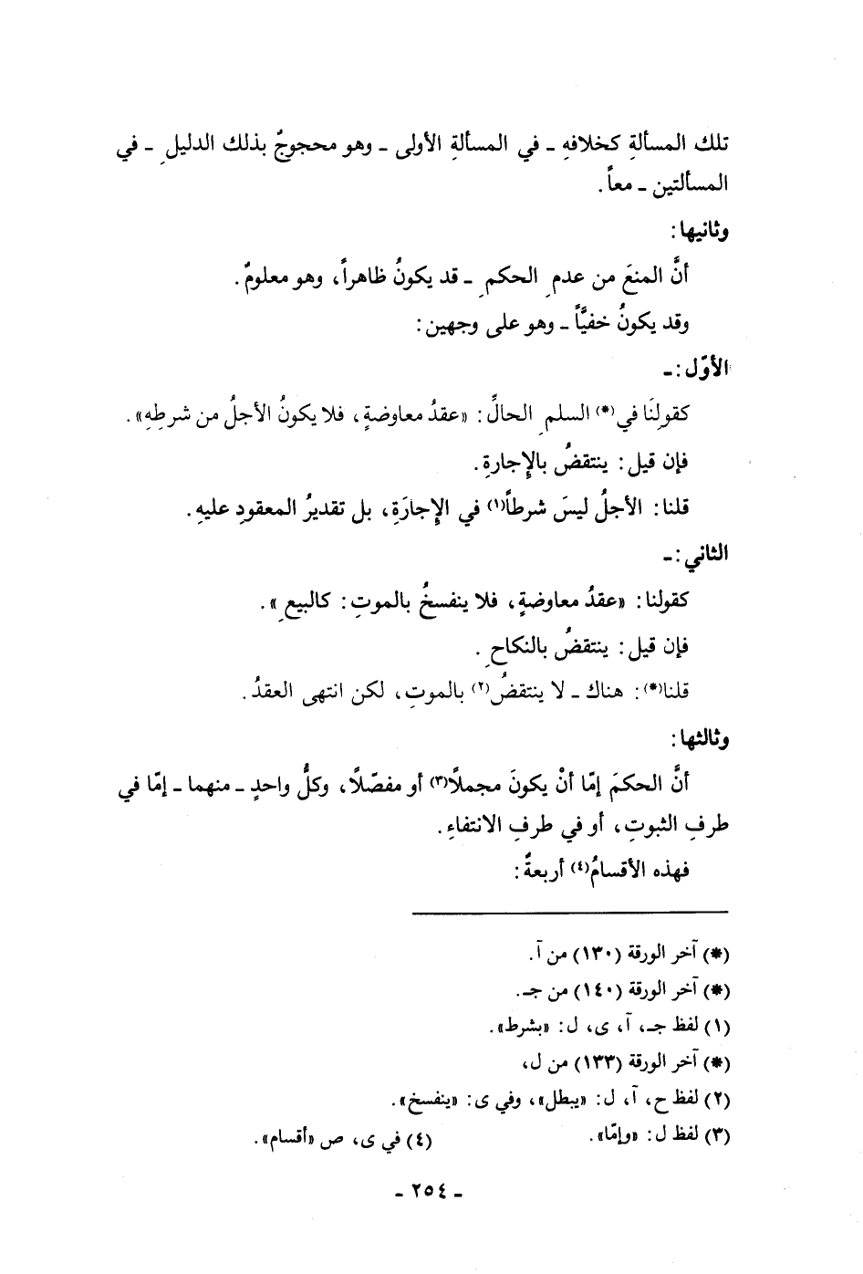 كقولنا عقد معاوضة فلا ينفسخ بالموت كالبيع فإن قيل ينتقض بالنكاح قلنا هناك لا ينتقض بالموت لكن انتهى العقد وثالثها أن الحكم إما أن يكون مجملا أو مفصلا وكل واحد منهما إما في طرف الثبوت أو في طرف الانتفاء فهذه الأقسام أربعة