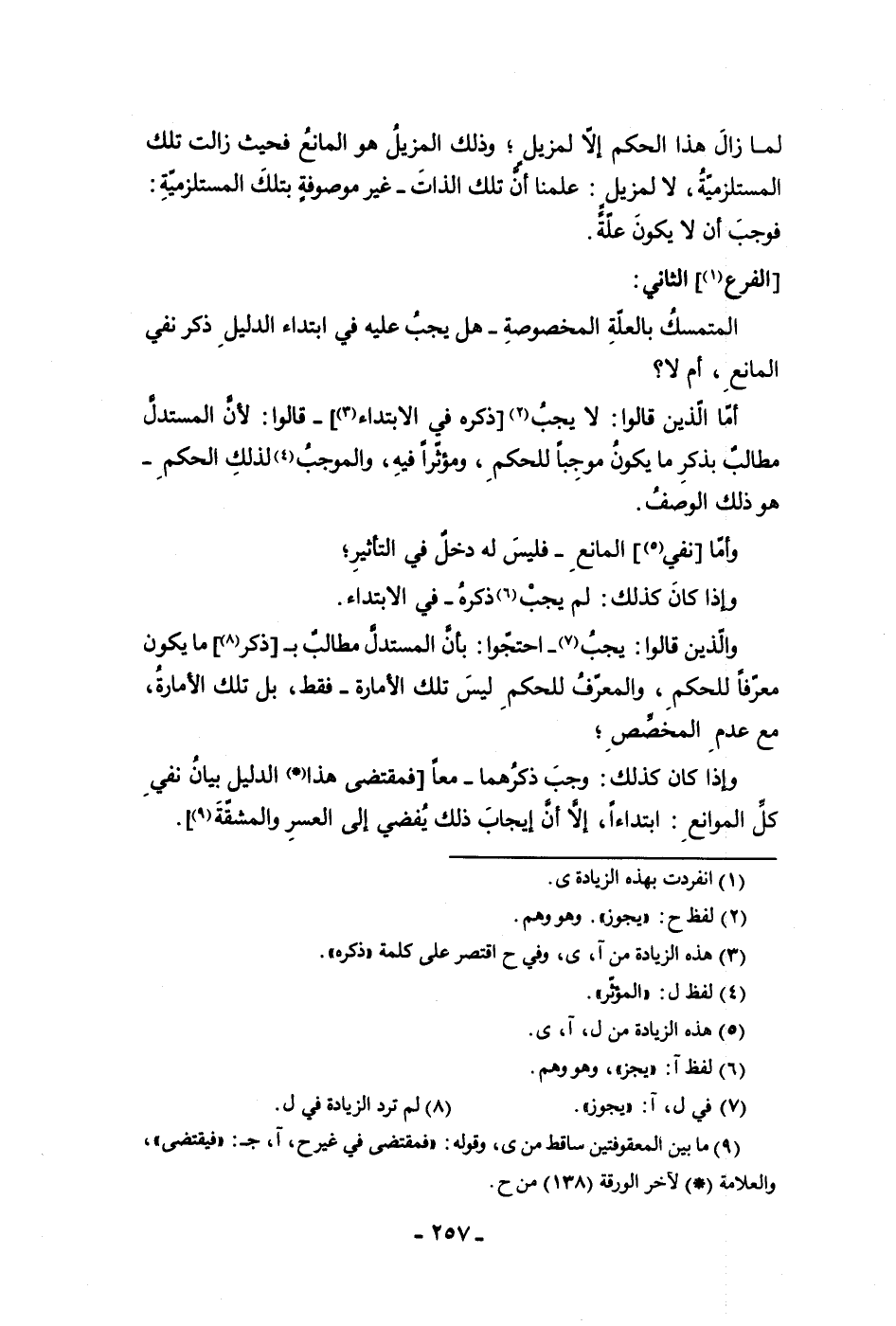 لما زال هذا الحكم إلا لمزيل وذلك المزيل هو المانع فحيث زالت تلك المستلزمية لا لمزيل علمنا أن تلك الذات غير موصوفة بتلك المستلزمية فوجب أن لا يكون علة الفرع الثاني المتمسك بالعلة المخصوصة هل يجب عليه في ابتداء الدليل ذكر نفي المانع أم لا أما الذين قالوا لا يجب ذكره في الابتداء قالوا لأن المستدل مطالب بذكر ما يكون موجبا للحكم ومؤثرا فيه والموجب لذلك الحكم هو ذلك الوصف وأما نفي المانع فليس له دخل في التأثير وإذا كان كذلك لم يجب ذكره في الابتداء والذين قالوا يجب احتجوا بأن المستدل مطالب بذكر ما يكون معرفا للحكم والمعرف للحكم ليس تلك الأمارة فقط بل تلك الأمارة مع عدم المخصص وإذا كان كذلك وجب ذكرهما معا فمقتضى هذا الدليل بيان نفي كل الموانع ابتداءا إلا أن إيجاب ذلك يفضي إلى العسر والمشقة