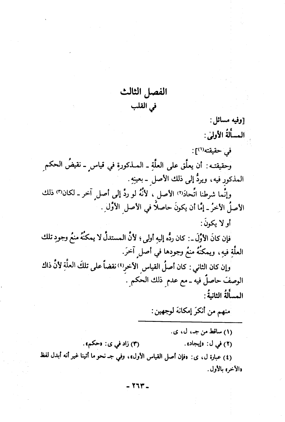 الفصل الثالث في القلب وفيه مسائل المسألة الأولى في حقيقته وحقيقتة أن يعلق على العلة المذكورة في قياس نقيض الحكم المذكور فيه ويرد إلى ذلك الأصل بعينه وإنما شرطنا إتحاد الأصل لأنه لو رد إلى أصل آخر لكان ذلك الأصل الآخر إما أن يكون حاصلا في الأصل الأول أو لا يكون فإن كان الأول كان رده إليه أولى لأن المستدل لا يمكنه منع وجود تلك العلة فيه ويمكنه منع وجودها في أصل آخر وإن كان الثاني كان أصل القياس الآخر نقضا على تلك العلة لأن ذلك الوصف حاصل فيه مع عدم ذلك الحكم المسألة الثانية منهم من أنكر إمكانه لوجهين