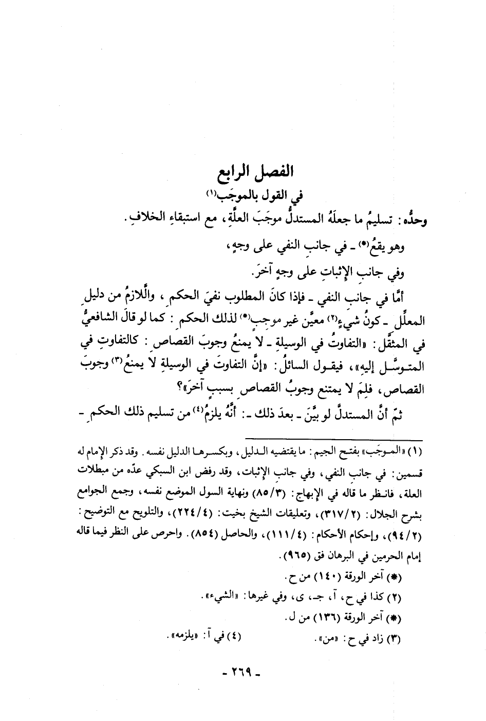 الفصل الرابع في القول بالموجب وحده تسليم ما جعله المستدل موجب العلة مع استبقاء الخلاف وهو يقع في جانب النفي على وجه وفي جانب الإثبات على وجه أخر أما في جانب النفي فإذا كان المطلوب نفى الحكم واللازم من دليل المعلل كون شئ معين غير موجب لذلك الحكم كما لو قال الشافعى في المثقل التفاوت في الوسيلة لا يمنع وجوب القصاص كالتفاوت في المتوسل إليه فيقول السائل إن التفاوت في الوسيلة لا يمنع وجوب القصاص فلم لا يمتنع وجوب القصاص بسبب آخر ثم أن المستدل لو بين بعد ذلك أنه يلزم من تسليم ذلك الحكم