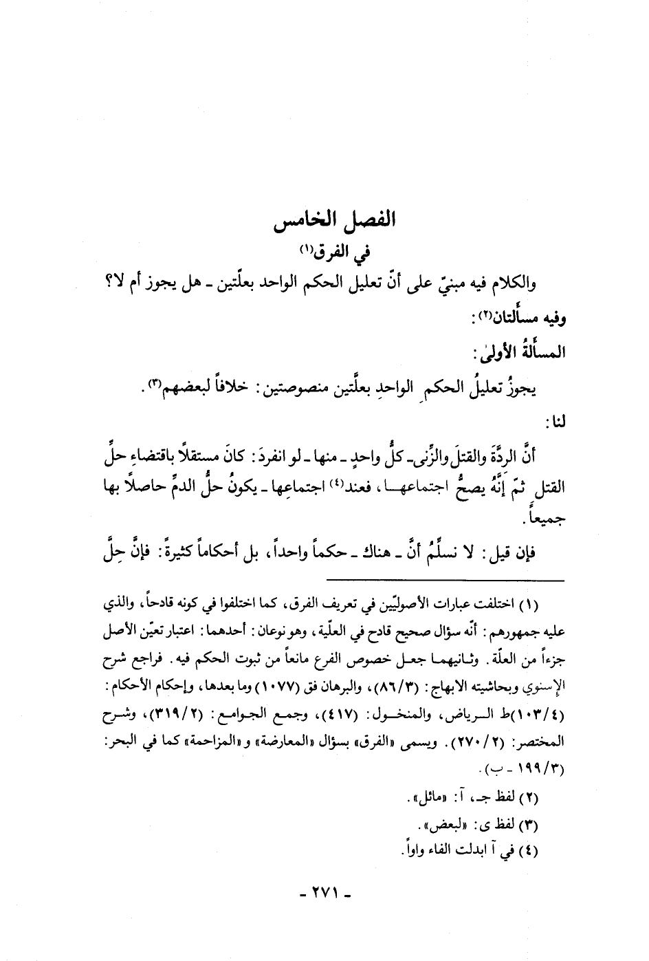 الفصل الخامس في الفرق والكلام فيه مبني على أن تعليل الحكم الواحد بعلتين هل يجوز أم لا وفيه مسألتان المسألة الأولى يجوز تعليل الحكم الواحد بعلتين منصوصتين خلافا لبعضهم لنا أن الردة والقتل والزنا كل واحد منها لو انفرد كان مستقلا باقتضاء حل القتل ثم إنه يصح اجتماعها فعند اجتماعها يكون حل الدم حاصلا بها جميعا فإن قيل لا نسلم أن هناك حكما واحدا بل أحكاما كثيرة فإن حل