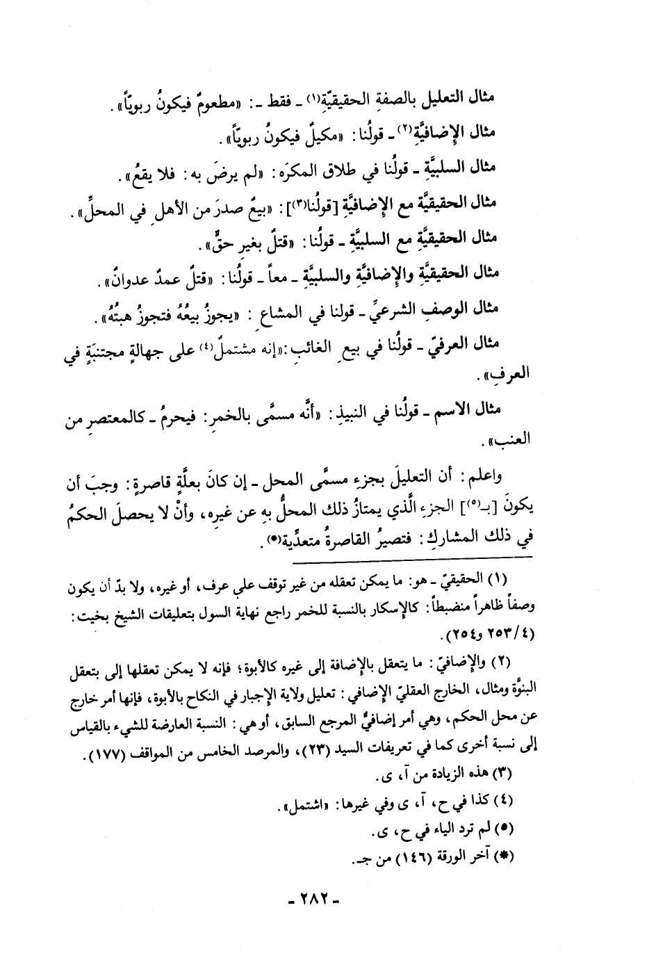 مثال الحقيقية مع السلبية قولنا قتل بغير حق مثال الحقيقية والإضافية والسلبية معا قولنا قتل عمد عدوان مثال الوصف الشرعي قولنا في المشاع يجوز بيعه فتجوز هبته مثال العرفي قولنا في بيع الغائب أنه مشتمل على جهالة مجتنبة في العرف مثال الاسم قولنا في النبيذ أنه مسمى بالخمر فيحرم كالمعتصر من العنب وأعلم أن التعليل بجزء مسمى المحل إن كان بعلة قاصرة وجب أن يكون بالجزء الذي يمتاز ذلك المحل به عن غيره وأن لا يحصل الحكم في ذلك المشارك فتصير القاصرة متعدية