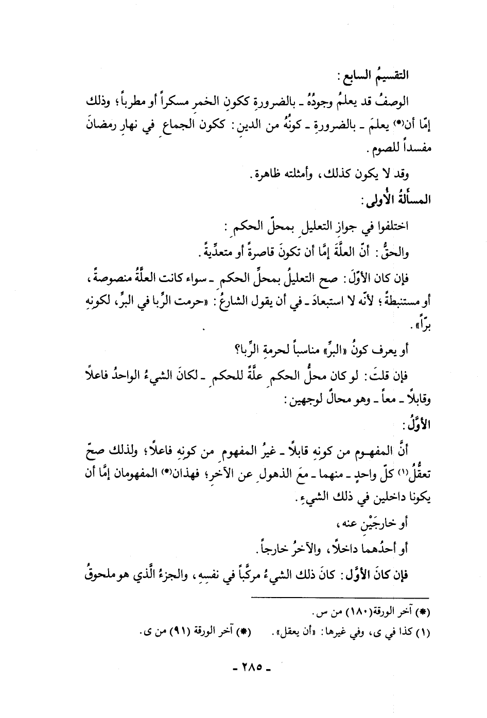الوصف قد يعلم وجوده بالضرورة ككون الخمر مسكرا أو مطربا وذلك إما أن يعلم بالضرورة كونه من الدين ككون الجماع في نهار رمضان مفسدا للصوم وقد لا يكون كذلك وأمثلته ظاهرة المسألة الأولى اختلفوا في جواز التعليل بمحل الحكم والحق أن العلة إما أن تكون قاصرة أو متعدية فإن كان الأول صح التعليل بمحل الحكم سواء كانت العلة منصوصة أو مستنبطة لأنه لا استبعاد في أن يقول الشارع حرمت الربا في البر لكونه برا أو يعرف كون البر مناسبا لحرمة الربا فإن قلت لو كان محل الحكم علة للحكم لكان الشئ الواحد فاعلا وقابلا معا وهو محال لوجهين الأول أن المفهوم من كونه قابلا غير المفهوم من كون فاعلا ولذلك صح تعقل كل واحد منهما مع الذهول عن الآخر فهذان المفهومان إما أن يكونا داخلين في ذلك الشئ أو خارجين عنه أو أحدهما داخلا والآخر خارجا فإن كان الأول كان ذلك الشئ مركبا في نفسه والجزء الذي هو ملحوق